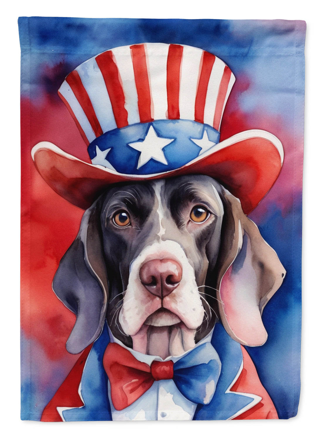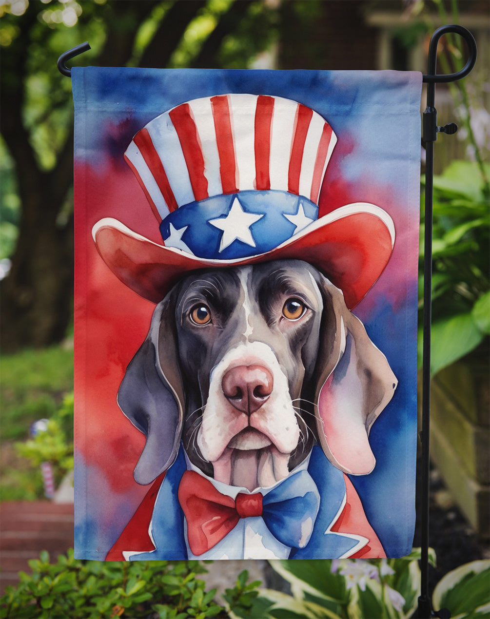 Garden Flag featuring breed specific Pointer artwork. Enhance the beauty of your garden, patio, or yard with Caroline's Treasures Decorative Garden Flag, proudly made in the USA. Crafted from two pieces of thick, double-sided polyester fabric, this 2-ply garden flag is designed to withstand various weather conditions, making it water-resistant and weatherproof. Featuring correctly readable words on both sides, this garden flag offers a delightful visual experience from any angle. With its heavier weight, it stands out among other garden flags, ensuring stability and durability even in wind, rain, and snow. Measuring approximately 11 1/4 inches by 15 1/2 inches, this flag allows you to personalize your outdoor decor. It comes with a 1 1/2-inch sleeve sewn in, allowing easy attachment to any standard garden flag stand or garden size porch hanger (sold separately). Make a statement in your outdoor space with Caroline's Treasures Decorative Garden Flag, a vibrant and high-quality flag that adds color and personality to your surroundings. Proudly made in the USA, it's a symbol of quality craftsmanship and attention to detail.