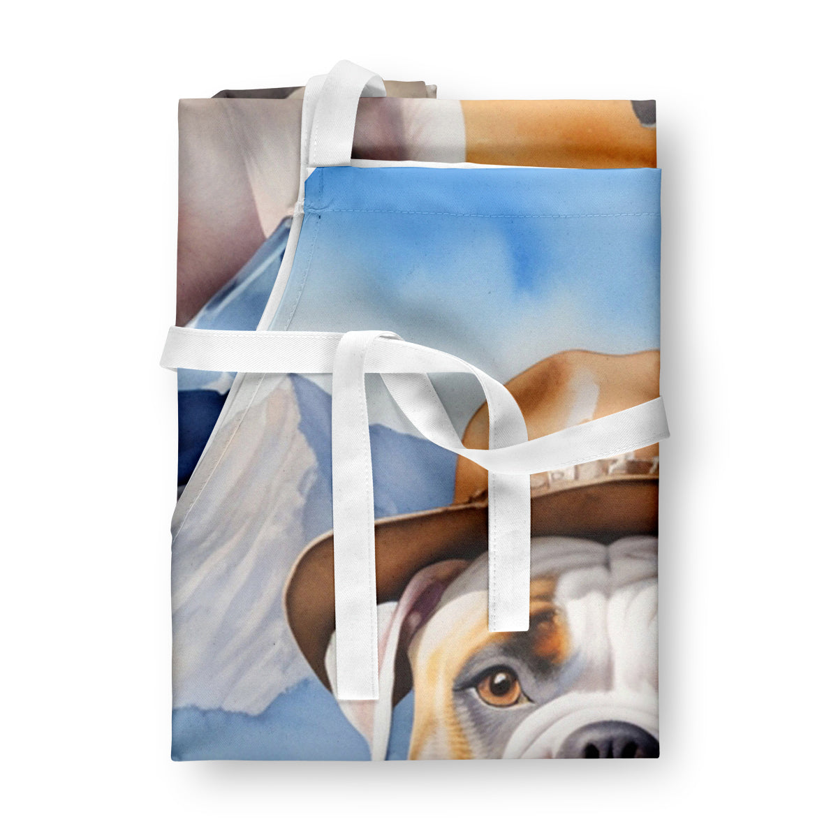 Apron featuring breed specific American Bulldog artwork. Elevate your cooking, baking, and grilling experiences with our versatile Kitchen or BBQ Apron. This Bib Style apron isn't just limited to culinary activities - it also serves as an excellent baking apron, artist apron, server apron, gardening apron, or even a dog grooming apron. The apron showcases vibrant full-color artwork contributed by one of our talented artists, bringing a dash of style to your daily tasks. With dimensions of approximately 27"W x 30"H, it provides ample coverage to protect your clothing from spills and splashes. Our apron is meticulously crafted from 100% Ultra Spun Polyester, known for its durability and lightweight nature. The apron comes with white tie straps, ensuring a comfortable and adjustable fit for all. It's a perfect choice for kitchen apron enthusiasts, whether you are a woman or a man. Designed for easy maintenance, this apron is fully machine washable. The quick-drying polyester material actively reduces staining, keeping your apron looking fresh and new for longer. Our beautifully designed apron isn't just a functional kitchen accessory - it's a fashion statement in the culinary world!