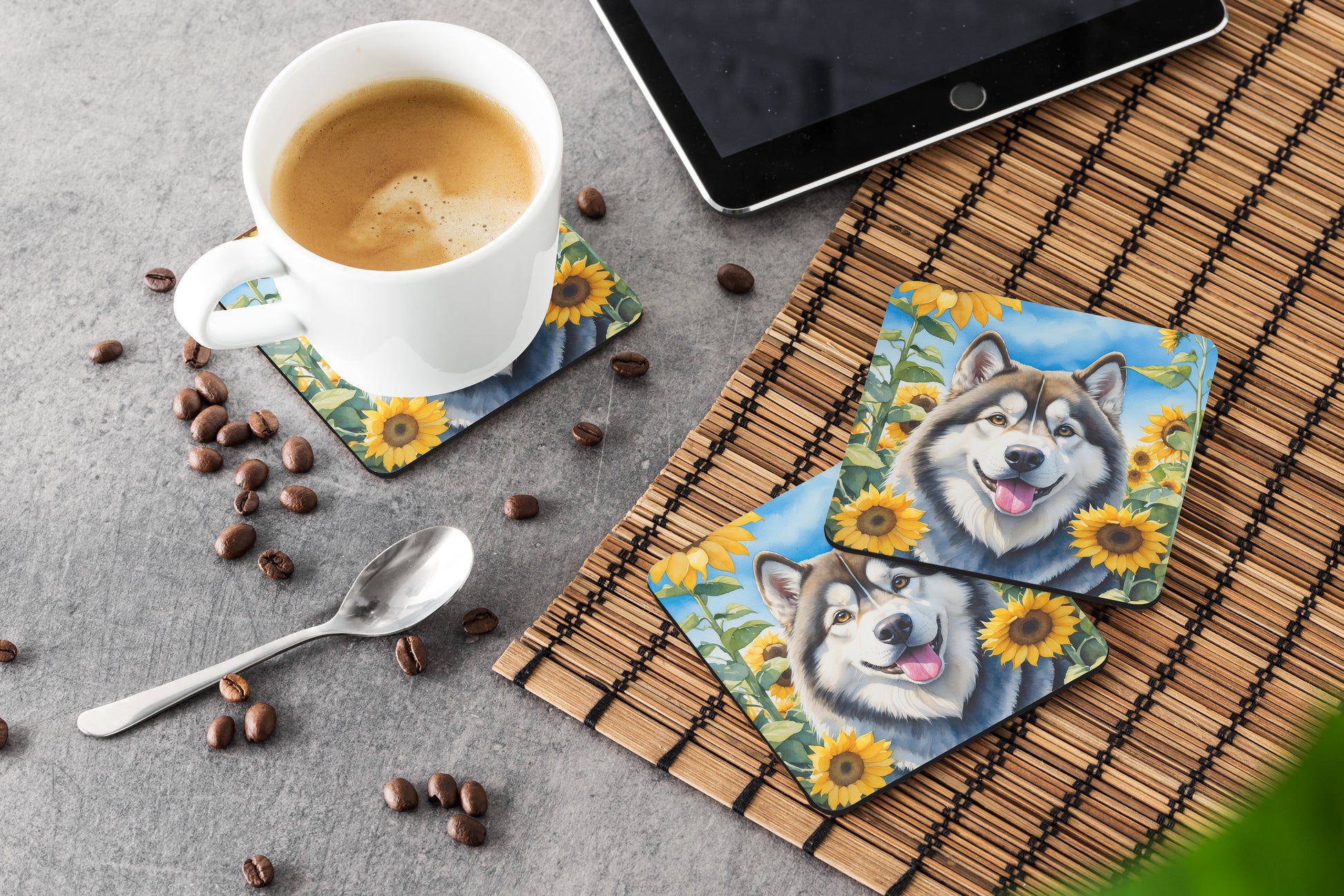 Foam Coasters featuring breed specific Alaskan Malamute artwork. Presenting our Set of 4 Foam Coasters, a stylish and practical addition to your table setting. Each square coaster, measuring 3 1/2 inches by 3 1/2 inches, is perfectly sized to accommodate various drinkware, from coffee mugs to tumblers. These coasters stand out with their full-color artwork, permanently dyed onto the material for a vibrant and fade-resistant finish. They're not just functional, they're a fashionable statement, adding a touch of flair to any gathering or event. Our foam coasters serve a dual purpose - they protect your table from water stains and are perfect for both hot and cold drinks. The material used is similar to that of our high-quality mouse pads, ensuring durability and heat resistance. These coasters are easy to maintain - simply wash them in the top of your dishwasher and lay flat to dry. The design won't come off, ensuring they retain their vivid colors for years. Pair them with one of our insulated coolers or huggers for a cohesive, thoughtful gift set. Enhance your beverage experience with our Set of 4 Foam Coasters.