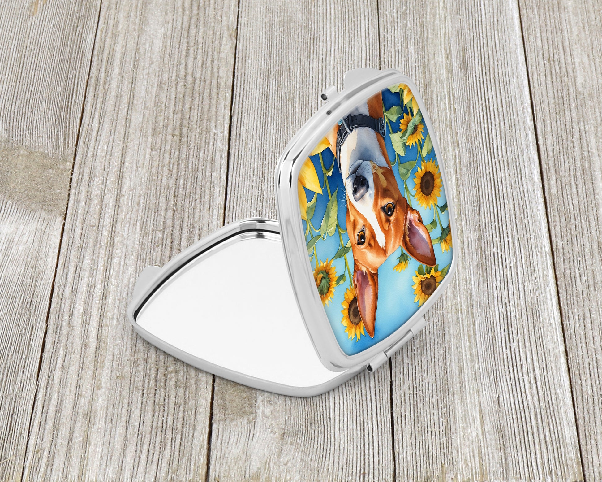 Compact Mirror featuring breed specific Basenji artwork. Introducing our Square Compact Mirror, a blend of elegance, functionality, and compactness, perfect for on-the-go touch-ups. This Silvertone metal mirror, with dimensions of 2.75 inches x 3 inches x .3 inches, fits effortlessly into your purse, handbag, or pocket, ensuring that you can check your appearance anytime, anywhere. Our compact mirror stands out with its eye-catching artwork on the front, adding a dash of style to this practical accessory. It is more than just a mirror; it's a statement piece that reflects your personality and aesthetic. When opened, this compact reveals two mirrors inside, doubling your perspective for precise touch-ups. The Silvertone metal construction ensures durability while maintaining a lightweight feel, making it an ideal everyday carry item. Whether you're rushing to a meeting, prepping for a dinner date, or just need a quick check on your look, our Square Compact Mirror is your reliable companion. Experience the perfect blend of style and practicality with this must-have accessory.