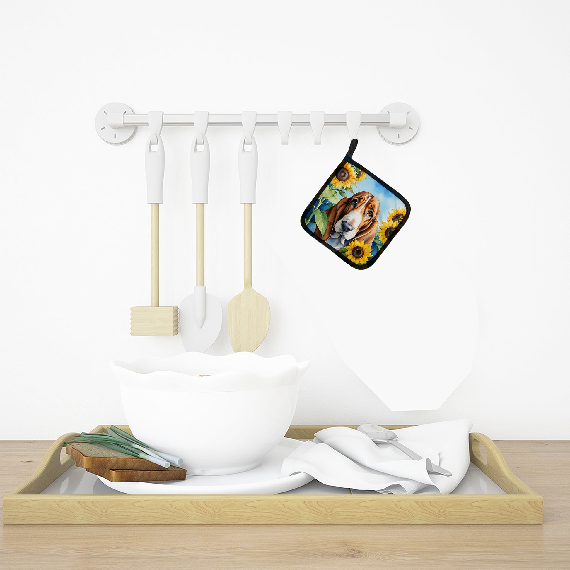 Pair of Pot Holders featuring breed specific Basset Hound artwork. A Pair of Pot Holders to match your kitchen decor. Made in the USA these are thick and functional. Full color artwork decorates the front polyester fabric of the hot pad and accented by a black trim. Use these at as a trivet for your Thanksgiving or Christmas tablescape. Filled with insulated fabric and quilted for durability. These colorful pot holders will make a great gift for your favorite home cook or executive chef. Each pot holder measures approximately 7 1/2 inches by 7 1/2 inches. A hanging tab is included.