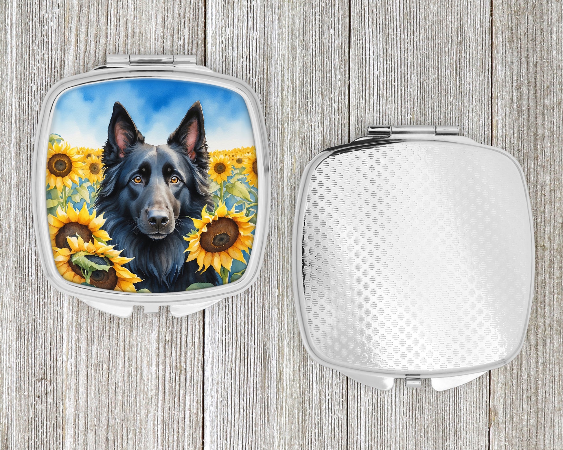 Compact Mirror featuring breed specific Belgian Sheepdog artwork. Introducing our Square Compact Mirror, a blend of elegance, functionality, and compactness, perfect for on-the-go touch-ups. This Silvertone metal mirror, with dimensions of 2.75 inches x 3 inches x .3 inches, fits effortlessly into your purse, handbag, or pocket, ensuring that you can check your appearance anytime, anywhere. Our compact mirror stands out with its eye-catching artwork on the front, adding a dash of style to this practical accessory. It is more than just a mirror; it's a statement piece that reflects your personality and aesthetic. When opened, this compact reveals two mirrors inside, doubling your perspective for precise touch-ups. The Silvertone metal construction ensures durability while maintaining a lightweight feel, making it an ideal everyday carry item. Whether you're rushing to a meeting, prepping for a dinner date, or just need a quick check on your look, our Square Compact Mirror is your reliable companion. Experience the perfect blend of style and practicality with this must-have accessory.