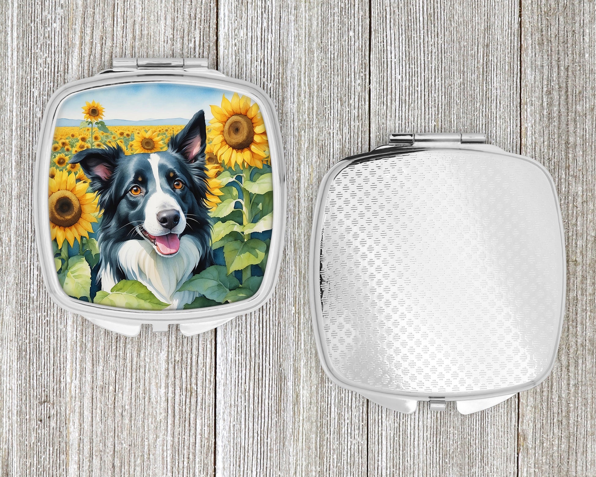 Compact Mirror featuring breed specific Border Collie artwork. Introducing our Square Compact Mirror, a blend of elegance, functionality, and compactness, perfect for on-the-go touch-ups. This Silvertone metal mirror, with dimensions of 2.75 inches x 3 inches x .3 inches, fits effortlessly into your purse, handbag, or pocket, ensuring that you can check your appearance anytime, anywhere. Our compact mirror stands out with its eye-catching artwork on the front, adding a dash of style to this practical accessory. It is more than just a mirror; it's a statement piece that reflects your personality and aesthetic. When opened, this compact reveals two mirrors inside, doubling your perspective for precise touch-ups. The Silvertone metal construction ensures durability while maintaining a lightweight feel, making it an ideal everyday carry item. Whether you're rushing to a meeting, prepping for a dinner date, or just need a quick check on your look, our Square Compact Mirror is your reliable companion. Experience the perfect blend of style and practicality with this must-have accessory.