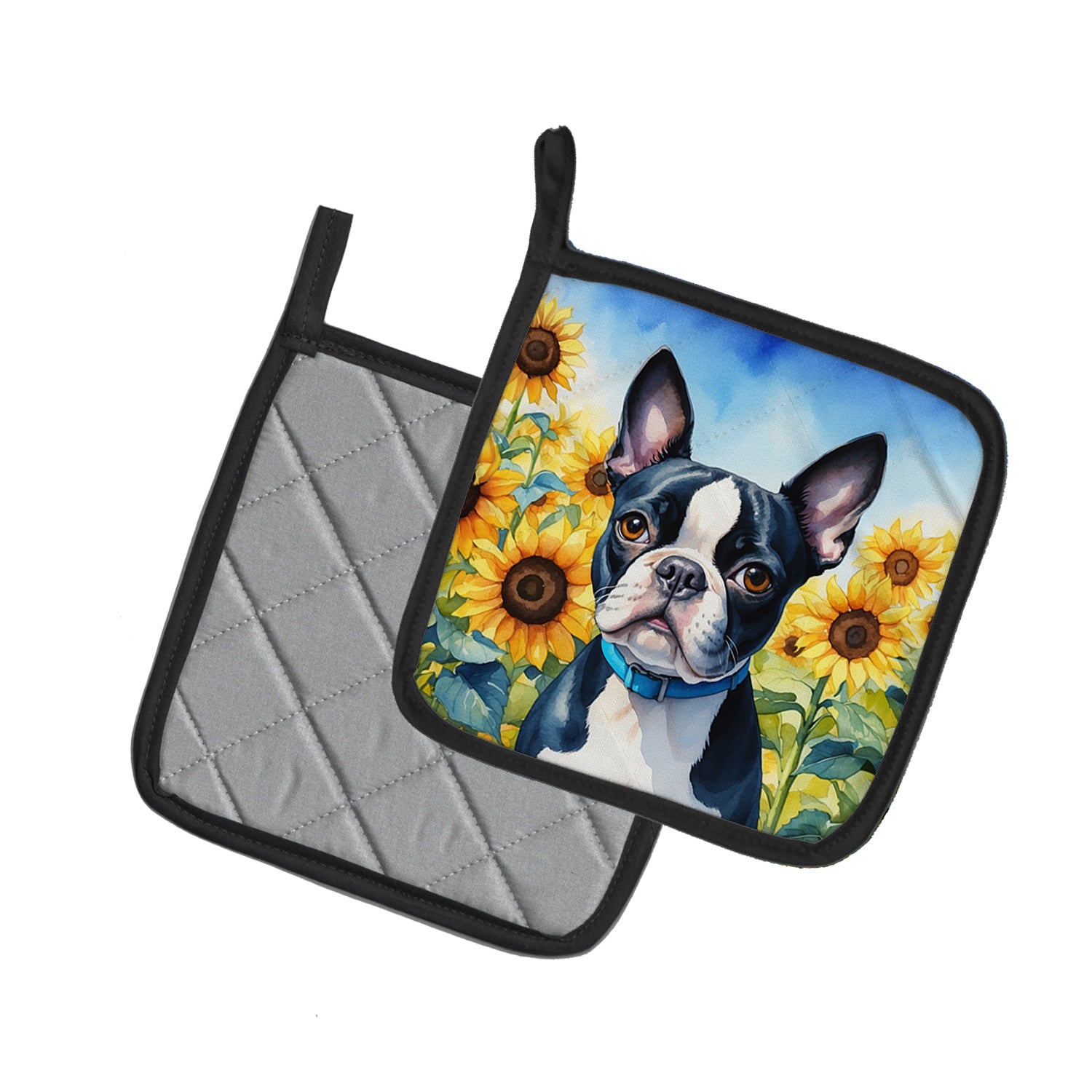 Boston Terrier in Sunflowers Pair of Pot Holders