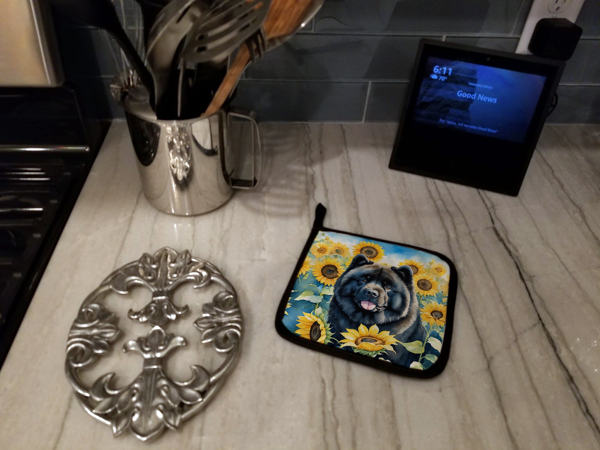 Pair of Pot Holders featuring breed specific Chow Chow artwork. A Pair of Pot Holders to match your kitchen decor. Made in the USA these are thick and functional. Full color artwork decorates the front polyester fabric of the hot pad and accented by a black trim. Use these at as a trivet for your Thanksgiving or Christmas tablescape. Filled with insulated fabric and quilted for durability. These colorful pot holders will make a great gift for your favorite home cook or executive chef. Each pot holder measures approximately 7 1/2 inches by 7 1/2 inches. A hanging tab is included.
