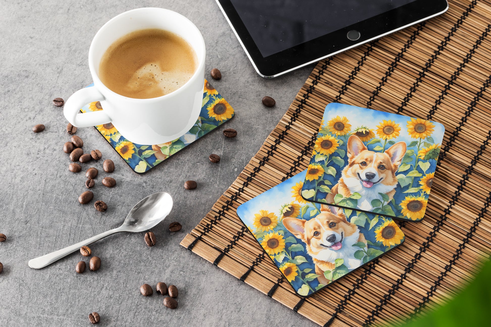 Foam Coasters featuring breed specific Corgi artwork. Presenting our Set of 4 Foam Coasters, a stylish and practical addition to your table setting. Each square coaster, measuring 3 1/2 inches by 3 1/2 inches, is perfectly sized to accommodate various drinkware, from coffee mugs to tumblers. These coasters stand out with their full-color artwork, permanently dyed onto the material for a vibrant and fade-resistant finish. They're not just functional, they're a fashionable statement, adding a touch of flair to any gathering or event. Our foam coasters serve a dual purpose - they protect your table from water stains and are perfect for both hot and cold drinks. The material used is similar to that of our high-quality mouse pads, ensuring durability and heat resistance. These coasters are easy to maintain - simply wash them in the top of your dishwasher and lay flat to dry. The design won't come off, ensuring they retain their vivid colors for years. Pair them with one of our insulated coolers or huggers for a cohesive, thoughtful gift set. Enhance your beverage experience with our Set of 4 Foam Coasters.
