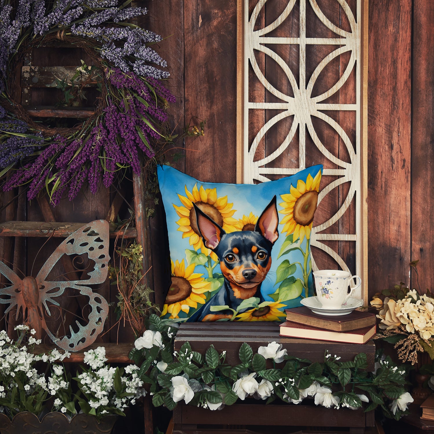 Throw Pillow featuring breed specific Miniature Pinscher artwork. Revitalize your outdoor or indoor living space with Caroline's Treasures 18x18 Fabric Decorative Pillow. With a generously sized dimension of approximately 18 inches by 18 inches, this pillow makes a comfortable and aesthetic addition to any seating area. Made from a unique, water-resistant material developed by Caroline's Treasures, the pillow sham is 100% polyester fabric that's durable and ready to weather any condition. Its vibrant, full-color artwork will not fade over time as it is dyed with color-fast dyes. Whether you place it on your patio furniture, porch, veranda, or indoor couch, its soft canvas fabric ensures a cozy experience. The pillow is handcrafted in the United States, featuring a sham created from three pieces of fabric and a polyester insert for enduring shape and overstuffed comfort. Despite being robustly built to endure the outdoors, it is as soft and snug as your favorite indoor cushions. Please note, as all our pillows are handmade, sizes may vary slightly, adding to the charm of this unique decorative item.