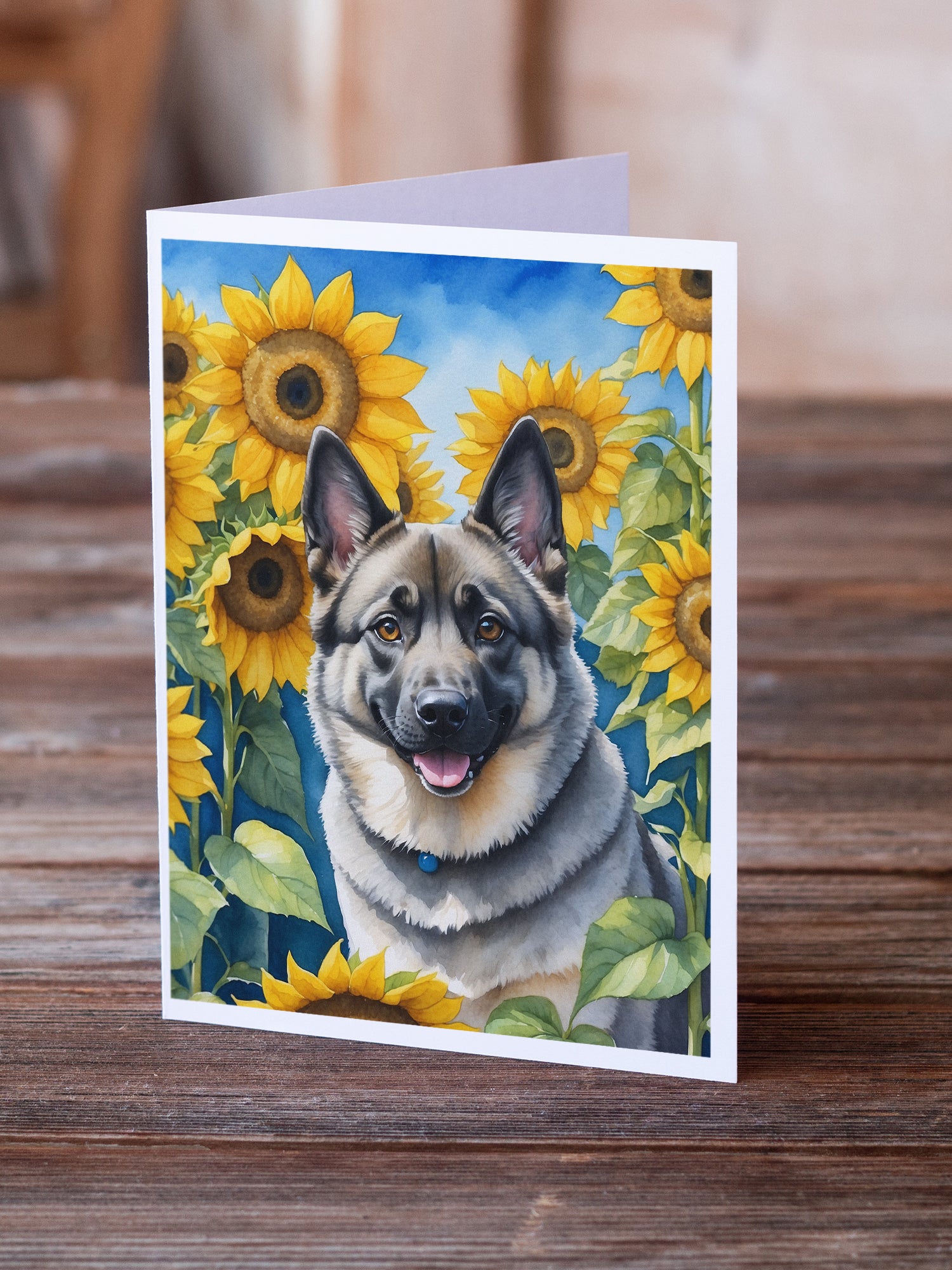 Norwegian Elkhound in Sunflowers Greeting Cards Pack of 8