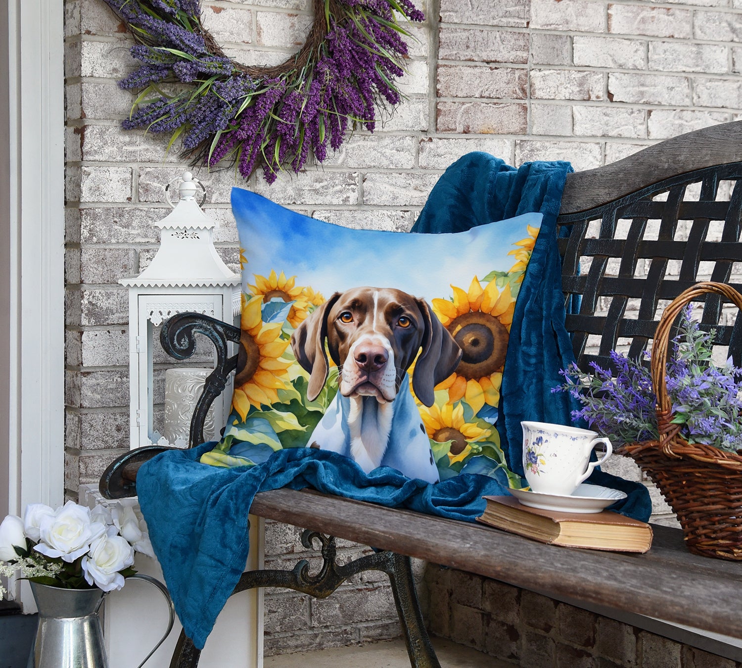 Pointer in Sunflowers Throw Pillow