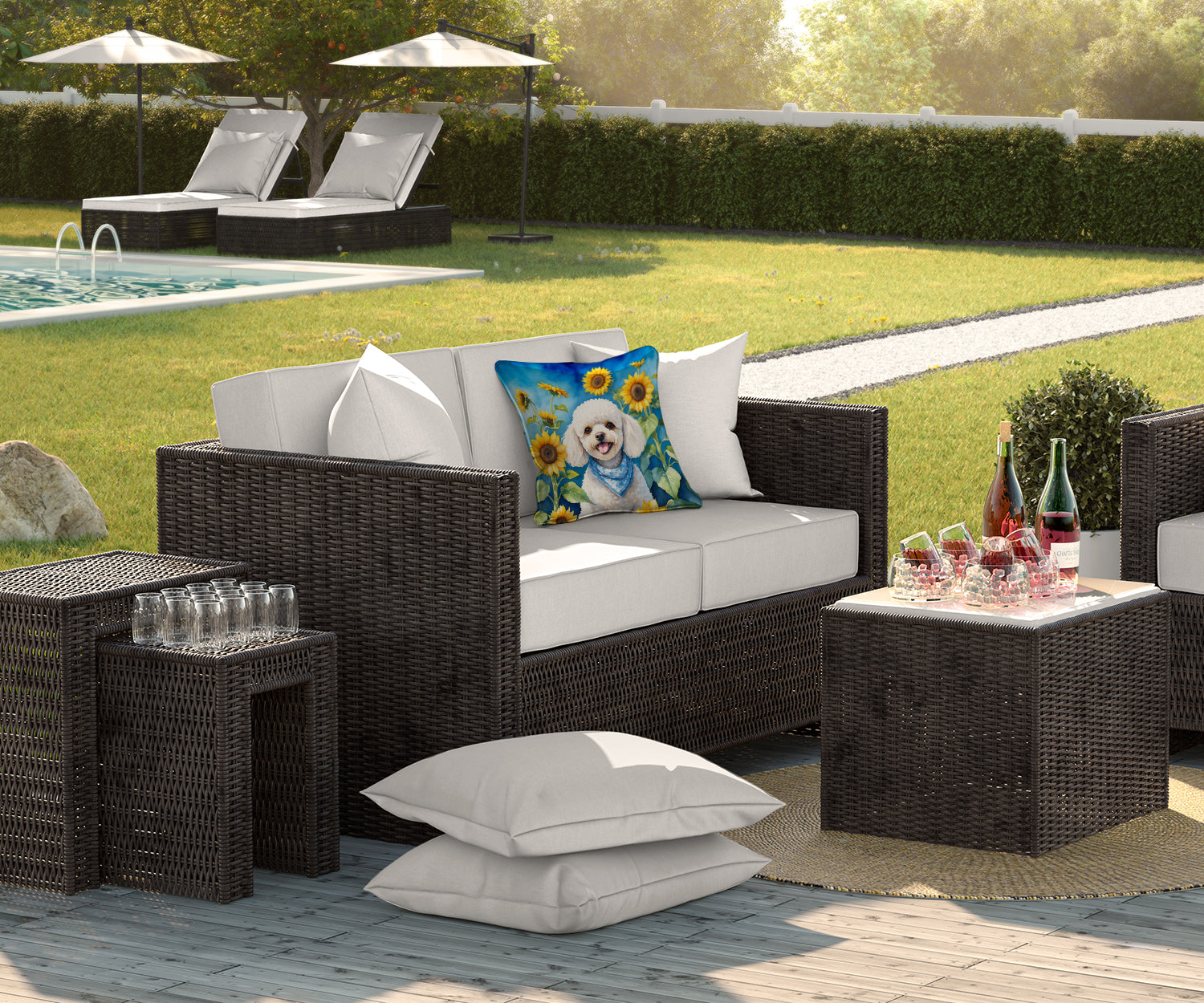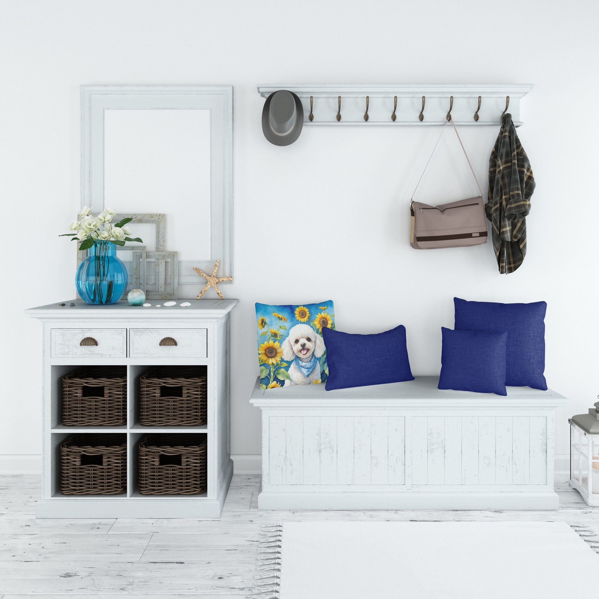 Throw Pillow featuring breed specific Poodle artwork. Revitalize your outdoor or indoor living space with Caroline's Treasures 18x18 Fabric Decorative Pillow. With a generously sized dimension of approximately 18 inches by 18 inches, this pillow makes a comfortable and aesthetic addition to any seating area. Made from a unique, water-resistant material developed by Caroline's Treasures, the pillow sham is 100% polyester fabric that's durable and ready to weather any condition. Its vibrant, full-color artwork will not fade over time as it is dyed with color-fast dyes. Whether you place it on your patio furniture, porch, veranda, or indoor couch, its soft canvas fabric ensures a cozy experience. The pillow is handcrafted in the United States, featuring a sham created from three pieces of fabric and a polyester insert for enduring shape and overstuffed comfort. Despite being robustly built to endure the outdoors, it is as soft and snug as your favorite indoor cushions. Please note, as all our pillows are handmade, sizes may vary slightly, adding to the charm of this unique decorative item.