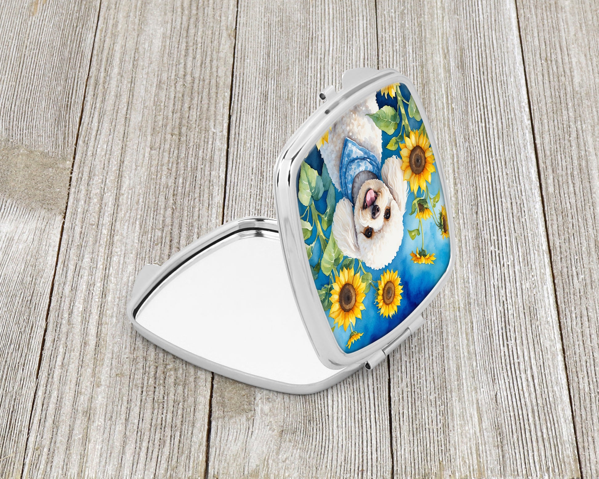 Compact Mirror featuring breed specific Poodle artwork. Introducing our Square Compact Mirror, a blend of elegance, functionality, and compactness, perfect for on-the-go touch-ups. This Silvertone metal mirror, with dimensions of 2.75 inches x 3 inches x .3 inches, fits effortlessly into your purse, handbag, or pocket, ensuring that you can check your appearance anytime, anywhere. Our compact mirror stands out with its eye-catching artwork on the front, adding a dash of style to this practical accessory. It is more than just a mirror; it's a statement piece that reflects your personality and aesthetic. When opened, this compact reveals two mirrors inside, doubling your perspective for precise touch-ups. The Silvertone metal construction ensures durability while maintaining a lightweight feel, making it an ideal everyday carry item. Whether you're rushing to a meeting, prepping for a dinner date, or just need a quick check on your look, our Square Compact Mirror is your reliable companion. Experience the perfect blend of style and practicality with this must-have accessory.