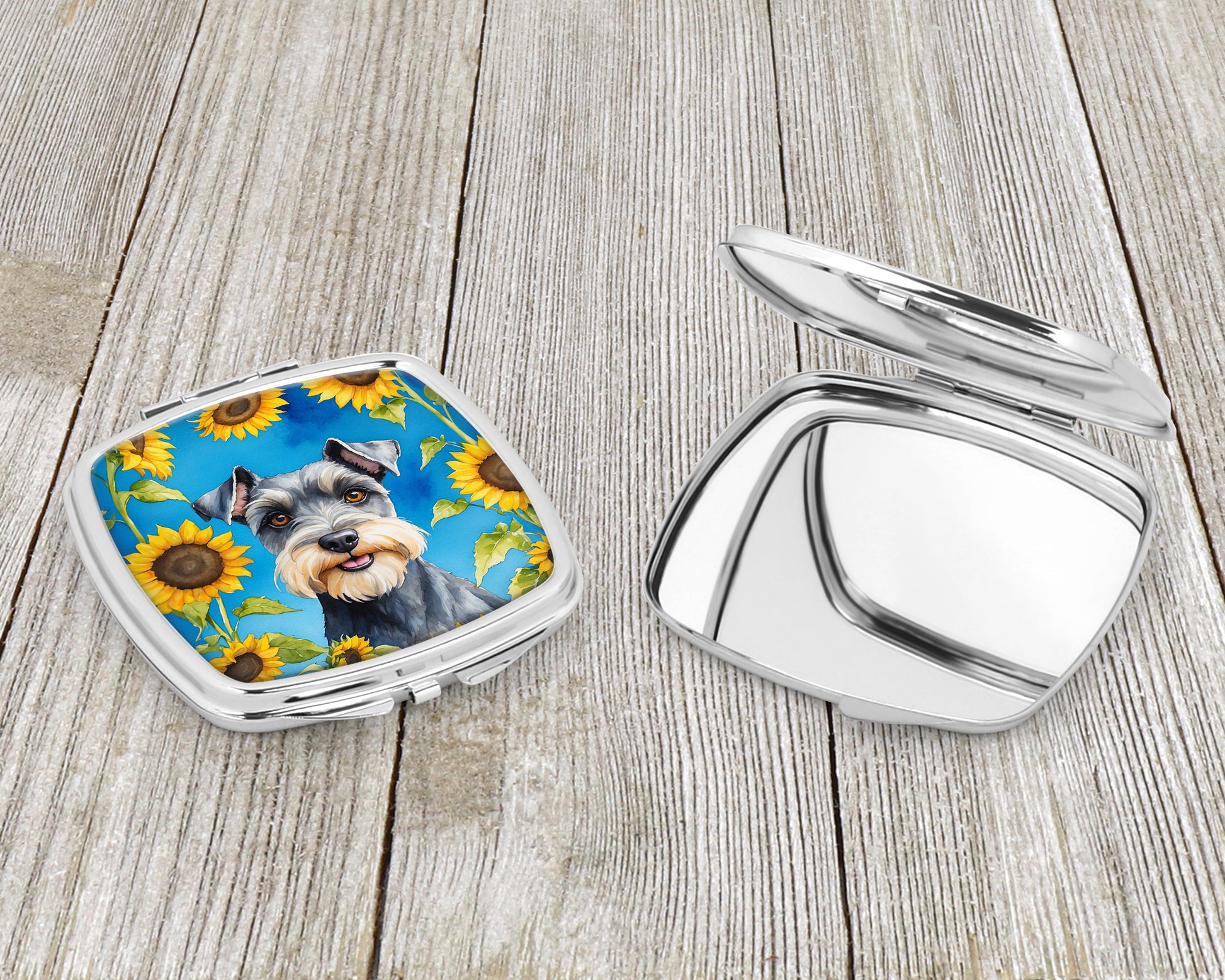 Compact Mirror featuring breed specific Schnauzer artwork. Introducing our Square Compact Mirror, a blend of elegance, functionality, and compactness, perfect for on-the-go touch-ups. This Silvertone metal mirror, with dimensions of 2.75 inches x 3 inches x .3 inches, fits effortlessly into your purse, handbag, or pocket, ensuring that you can check your appearance anytime, anywhere. Our compact mirror stands out with its eye-catching artwork on the front, adding a dash of style to this practical accessory. It is more than just a mirror; it's a statement piece that reflects your personality and aesthetic. When opened, this compact reveals two mirrors inside, doubling your perspective for precise touch-ups. The Silvertone metal construction ensures durability while maintaining a lightweight feel, making it an ideal everyday carry item. Whether you're rushing to a meeting, prepping for a dinner date, or just need a quick check on your look, our Square Compact Mirror is your reliable companion. Experience the perfect blend of style and practicality with this must-have accessory.