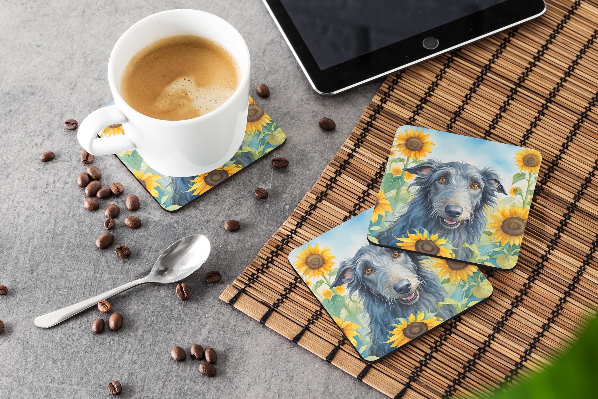 Foam Coasters featuring breed specific Scottish Deerhound artwork. Presenting our Set of 4 Foam Coasters, a stylish and practical addition to your table setting. Each square coaster, measuring 3 1/2 inches by 3 1/2 inches, is perfectly sized to accommodate various drinkware, from coffee mugs to tumblers. These coasters stand out with their full-color artwork, permanently dyed onto the material for a vibrant and fade-resistant finish. They're not just functional, they're a fashionable statement, adding a touch of flair to any gathering or event. Our foam coasters serve a dual purpose - they protect your table from water stains and are perfect for both hot and cold drinks. The material used is similar to that of our high-quality mouse pads, ensuring durability and heat resistance. These coasters are easy to maintain - simply wash them in the top of your dishwasher and lay flat to dry. The design won't come off, ensuring they retain their vivid colors for years. Pair them with one of our insulated coolers or huggers for a cohesive, thoughtful gift set. Enhance your beverage experience with our Set of 4 Foam Coasters.