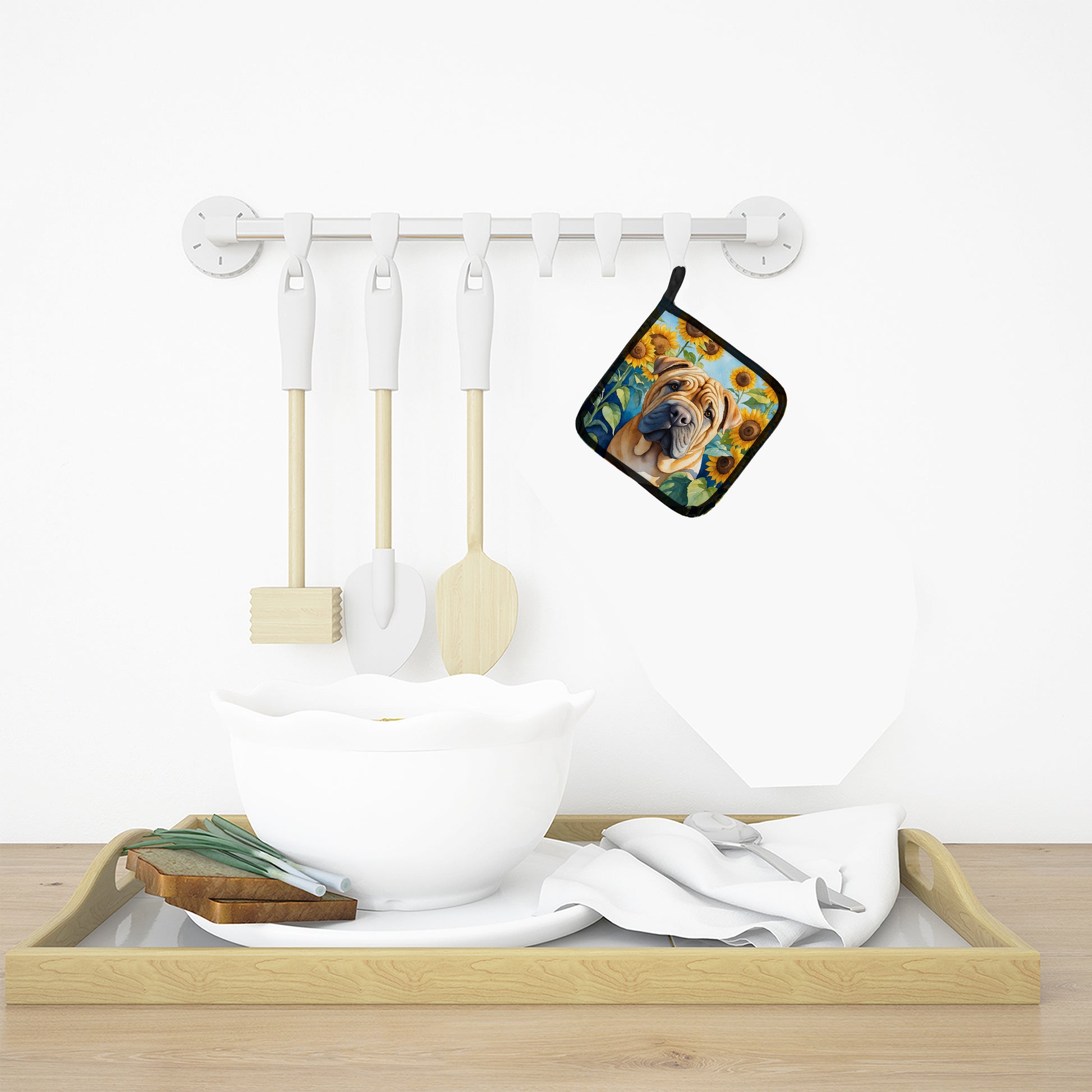 Pair of Pot Holders featuring breed specific Shar Pei artwork. A Pair of Pot Holders to match your kitchen decor. Made in the USA these are thick and functional. Full color artwork decorates the front polyester fabric of the hot pad and accented by a black trim. Use these at as a trivet for your Thanksgiving or Christmas tablescape. Filled with insulated fabric and quilted for durability. These colorful pot holders will make a great gift for your favorite home cook or executive chef. Each pot holder measures approximately 7 1/2 inches by 7 1/2 inches. A hanging tab is included.