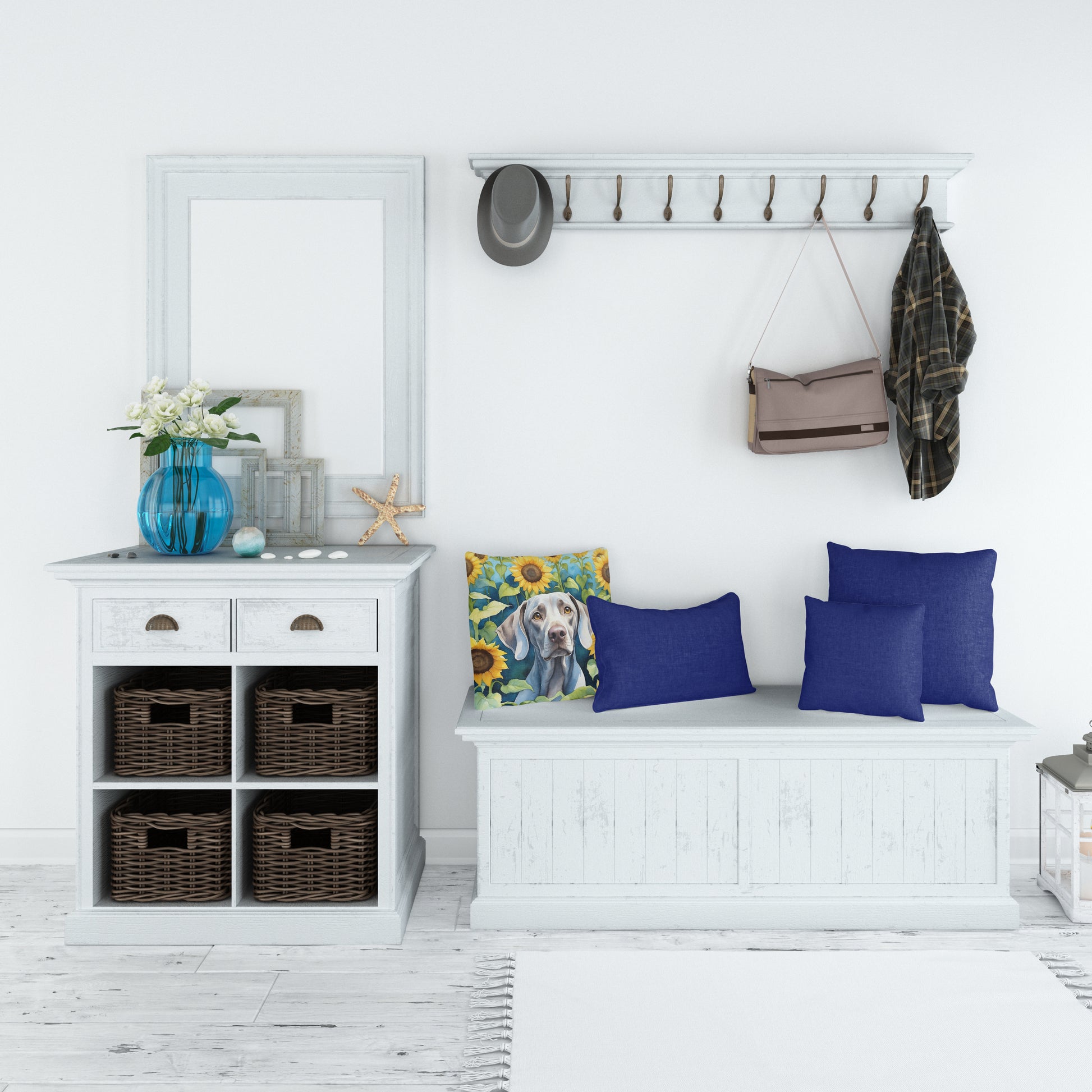 Throw Pillow featuring breed specific Weimaraner artwork. Revitalize your outdoor or indoor living space with Caroline's Treasures 18x18 Fabric Decorative Pillow. With a generously sized dimension of approximately 18 inches by 18 inches, this pillow makes a comfortable and aesthetic addition to any seating area. Made from a unique, water-resistant material developed by Caroline's Treasures, the pillow sham is 100% polyester fabric that's durable and ready to weather any condition. Its vibrant, full-color artwork will not fade over time as it is dyed with color-fast dyes. Whether you place it on your patio furniture, porch, veranda, or indoor couch, its soft canvas fabric ensures a cozy experience. The pillow is handcrafted in the United States, featuring a sham created from three pieces of fabric and a polyester insert for enduring shape and overstuffed comfort. Despite being robustly built to endure the outdoors, it is as soft and snug as your favorite indoor cushions. Please note, as all our pillows are handmade, sizes may vary slightly, adding to the charm of this unique decorative item.