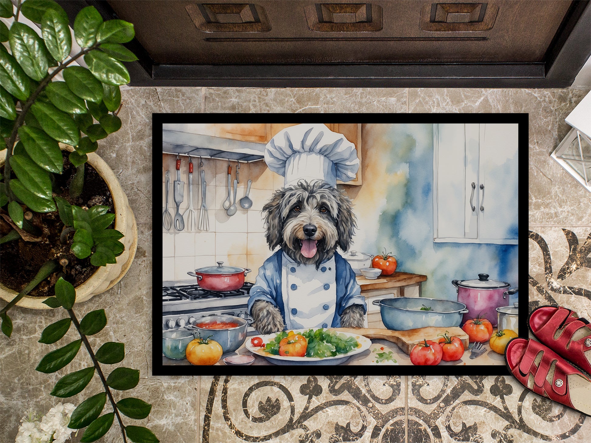 Doormat featuring breed specific Bergamasco Sheepdog artwork. Welcome your guests in style with our Artwork Door Mat, designed to withstand almost any weather condition. This mat, measuring approximately 18 by 27 inches, is held together by durable black binding tape. Its top layer, composed of polyester felt, is dyed with the eye-catching image you see on the mat. A few layers below provide the mat with stability, while its rubber bottom is stamped to help prevent slipping and ensures safety. Our mat works wonderfully as both an indoor or outdoor door mat. For cleaning, simply hose it off with water or use a power washer - no need for any cleaner that produces suds. Avoid scrubbing with a brush, instead, opt for the vacuum on floor setting. Designed manufactured and printed in the USA, this mat is a perfect addition to your porch, outdoor kitchen, entryway, or any indoor space. Its unique design makes it a charming decorative rug that greets your guests and adds a stylish touch to your home decor.