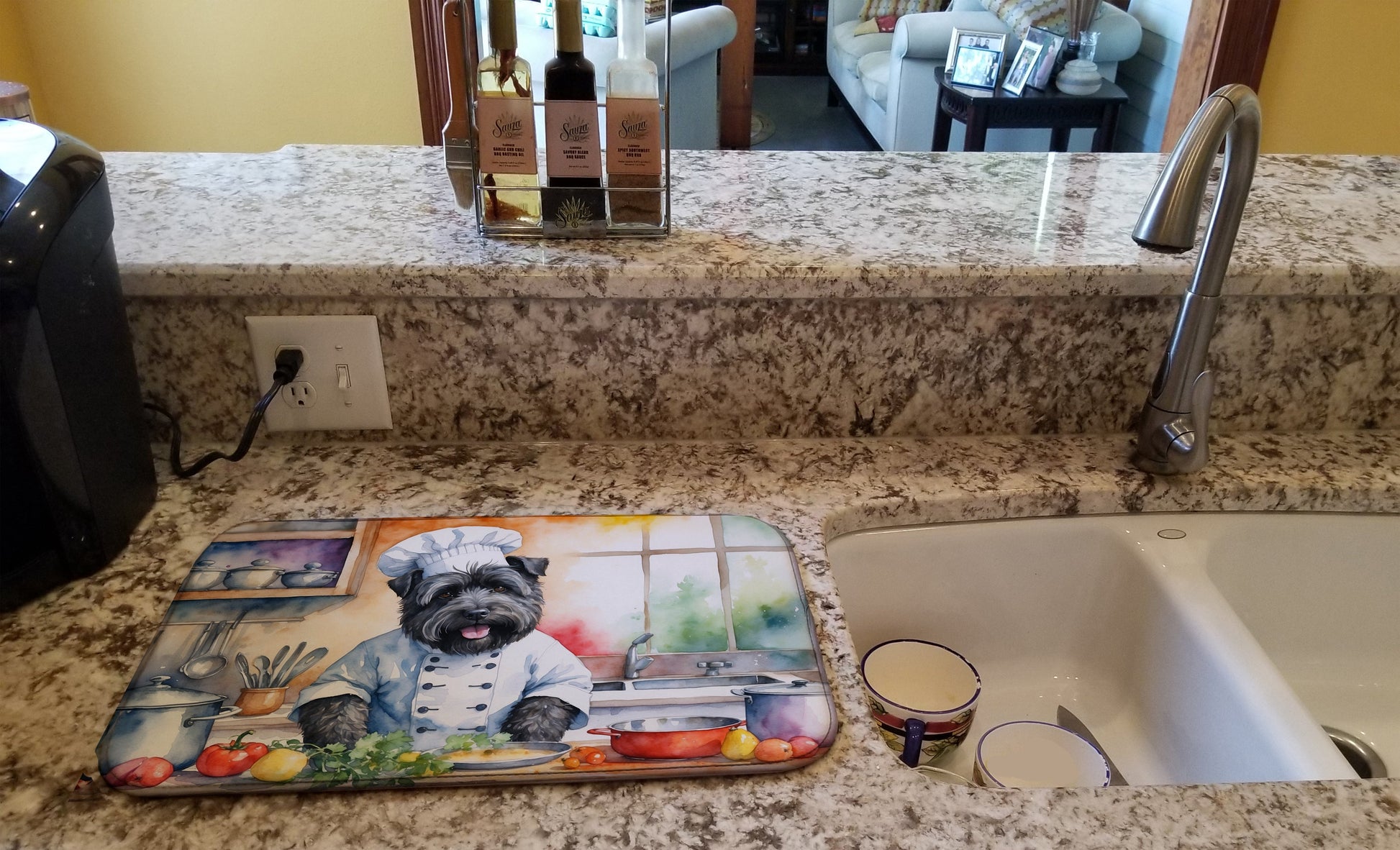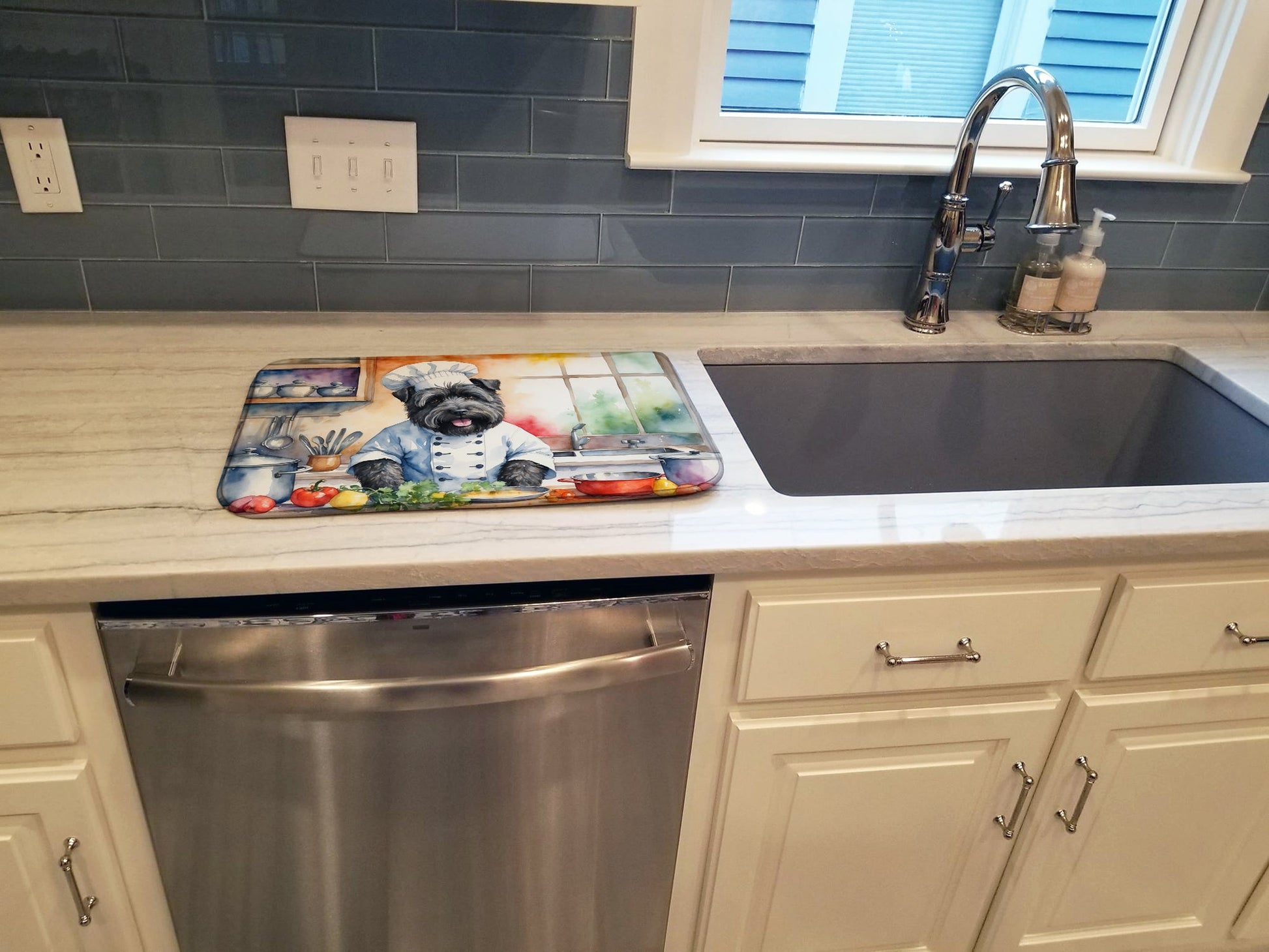 Dish Drying Mat featuring breed specific Bouvier des Flandres artwork. Say goodbye to messy countertops and soggy dish towels with our innovative dish drying mat. Our high-quality dish drying pad is designed to keep your countertops dry while offering a stylish and efficient solution. Whether you're air drying dishes, glasses, stemware, silverware, pots, pans, bottles, or even fruits and vegetables, our dish mat is the perfect choice. The 14 inches x 22 inches size fits most counters and dish drying racks, and the non-slip design ensures stability. Made with water-absorbent polyester and a polyurethane foam insert, our dish drying mat is not only functional but also durable. It's machine washable and printed in the USA for long-lasting use. The beautiful artwork adds flair to your kitchen decor, making it a perfect housewarming gift or present for any occasion. Upgrade your kitchen experience with our absorbent and versatile dish drying mat.