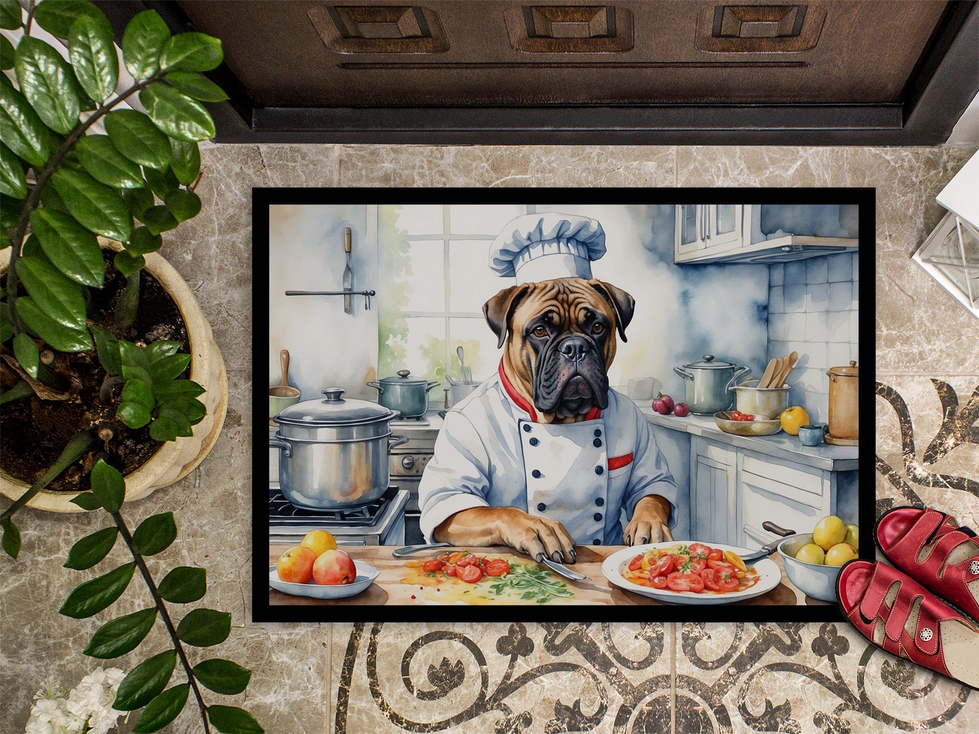 Doormat featuring breed specific Bullmastiff artwork. Welcome your guests in style with our Artwork Door Mat, designed to withstand almost any weather condition. This mat, measuring approximately 18 by 27 inches, is held together by durable black binding tape. Its top layer, composed of polyester felt, is dyed with the eye-catching image you see on the mat. A few layers below provide the mat with stability, while its rubber bottom is stamped to help prevent slipping and ensures safety. Our mat works wonderfully as both an indoor or outdoor door mat. For cleaning, simply hose it off with water or use a power washer - no need for any cleaner that produces suds. Avoid scrubbing with a brush, instead, opt for the vacuum on floor setting. Designed manufactured and printed in the USA, this mat is a perfect addition to your porch, outdoor kitchen, entryway, or any indoor space. Its unique design makes it a charming decorative rug that greets your guests and adds a stylish touch to your home decor.