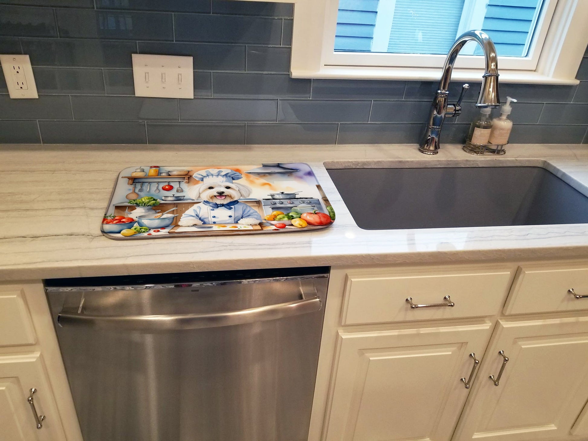 Dish Drying Mat featuring breed specific Coton de Tulear artwork. Say goodbye to messy countertops and soggy dish towels with our innovative dish drying mat. Our high-quality dish drying pad is designed to keep your countertops dry while offering a stylish and efficient solution. Whether you're air drying dishes, glasses, stemware, silverware, pots, pans, bottles, or even fruits and vegetables, our dish mat is the perfect choice. The 14 inches x 22 inches size fits most counters and dish drying racks, and the non-slip design ensures stability. Made with water-absorbent polyester and a polyurethane foam insert, our dish drying mat is not only functional but also durable. It's machine washable and printed in the USA for long-lasting use. The beautiful artwork adds flair to your kitchen decor, making it a perfect housewarming gift or present for any occasion. Upgrade your kitchen experience with our absorbent and versatile dish drying mat.