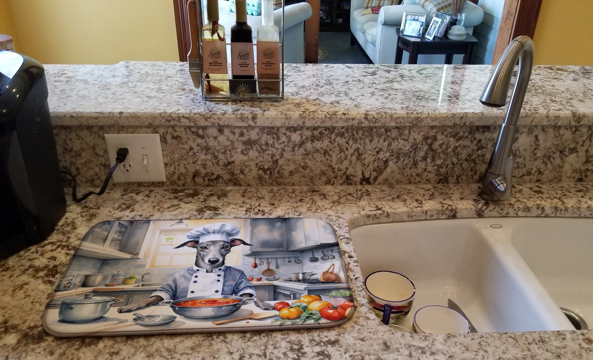 Dish Drying Mat featuring breed specific Greyhound artwork. Say goodbye to messy countertops and soggy dish towels with our innovative dish drying mat. Our high-quality dish drying pad is designed to keep your countertops dry while offering a stylish and efficient solution. Whether you're air drying dishes, glasses, stemware, silverware, pots, pans, bottles, or even fruits and vegetables, our dish mat is the perfect choice. The 14 inches x 22 inches size fits most counters and dish drying racks, and the non-slip design ensures stability. Made with water-absorbent polyester and a polyurethane foam insert, our dish drying mat is not only functional but also durable. It's machine washable and printed in the USA for long-lasting use. The beautiful artwork adds flair to your kitchen decor, making it a perfect housewarming gift or present for any occasion. Upgrade your kitchen experience with our absorbent and versatile dish drying mat.