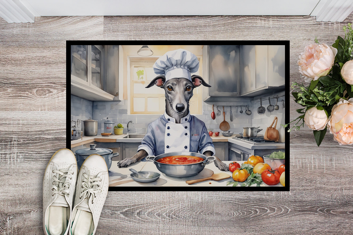 Doormat featuring breed specific Greyhound artwork. Welcome your guests in style with our Artwork Door Mat, designed to withstand almost any weather condition. This mat, measuring approximately 24 by 36 inches, is held together by durable black binding tape. Its top layer, composed of polyester felt, is dyed with the eye-catching image you see on the mat. A few layers below provide the mat with stability, while its rubber bottom is stamped to help prevent slipping and ensures safety. Our mat works wonderfully as both an indoor or outdoor door mat. For cleaning, simply hose it off with water or use a power washer - no need for any cleaner that produces suds. Avoid scrubbing with a brush, instead, opt for the vacuum on floor setting. Designed manufactured and printed in the USA, this mat is a perfect addition to your porch, outdoor kitchen, entryway, or any indoor space. Its unique design makes it a charming decorative rug that greets your guests and adds a stylish touch to your home decor.