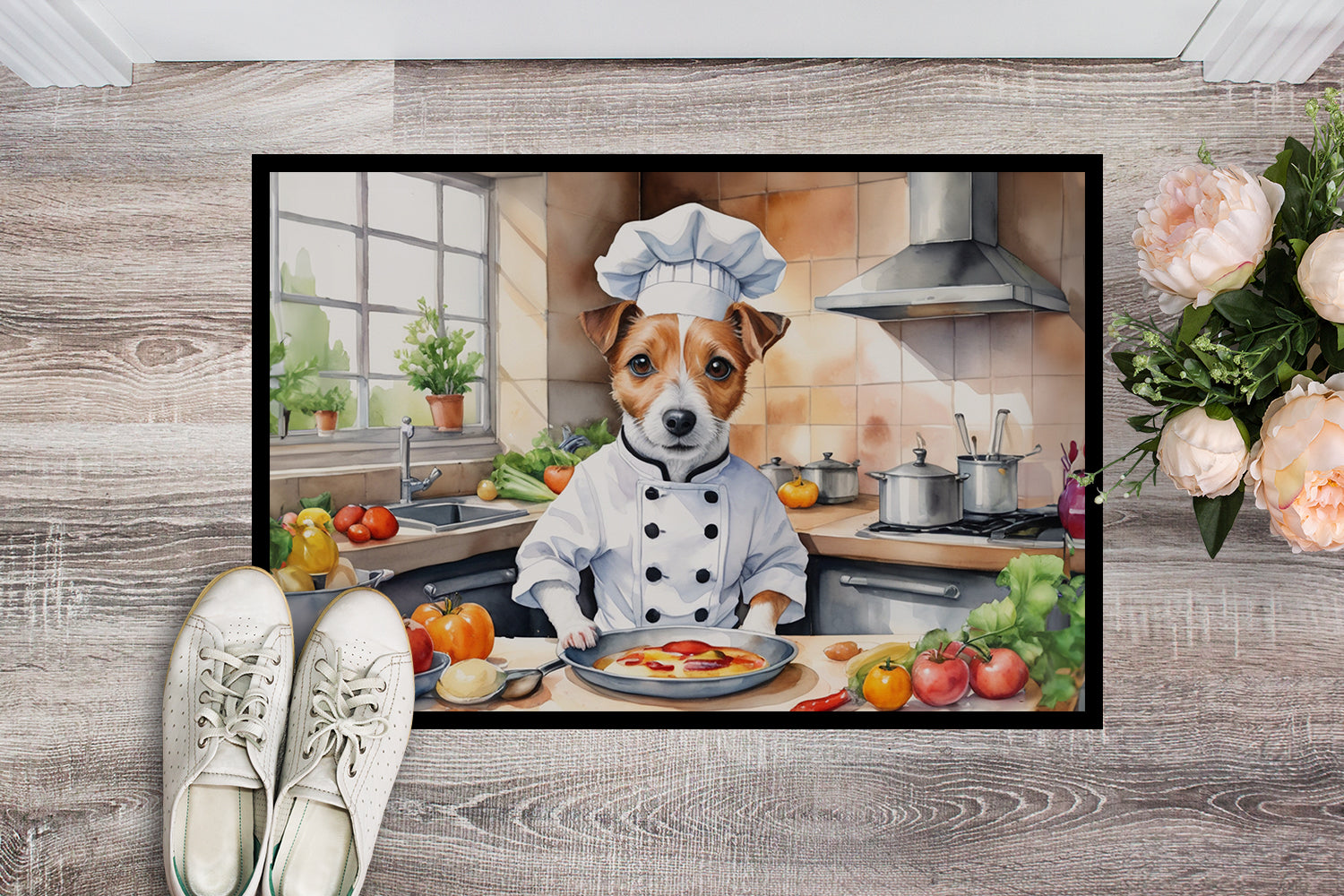 Doormat featuring breed specific Jack Russell Terrier artwork. Welcome your guests in style with our Artwork Door Mat, designed to withstand almost any weather condition. This mat, measuring approximately 24 by 36 inches, is held together by durable black binding tape. Its top layer, composed of polyester felt, is dyed with the eye-catching image you see on the mat. A few layers below provide the mat with stability, while its rubber bottom is stamped to help prevent slipping and ensures safety. Our mat works wonderfully as both an indoor or outdoor door mat. For cleaning, simply hose it off with water or use a power washer - no need for any cleaner that produces suds. Avoid scrubbing with a brush, instead, opt for the vacuum on floor setting. Designed manufactured and printed in the USA, this mat is a perfect addition to your porch, outdoor kitchen, entryway, or any indoor space. Its unique design makes it a charming decorative rug that greets your guests and adds a stylish touch to your home decor.