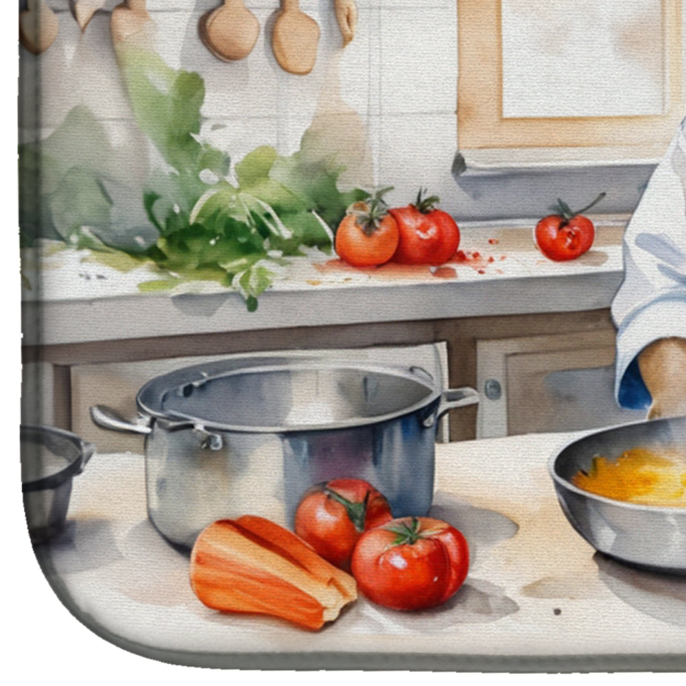 Dish Drying Mat featuring breed specific Norwegian Elkhound artwork. Say goodbye to messy countertops and soggy dish towels with our innovative dish drying mat. Our high-quality dish drying pad is designed to keep your countertops dry while offering a stylish and efficient solution. Whether you're air drying dishes, glasses, stemware, silverware, pots, pans, bottles, or even fruits and vegetables, our dish mat is the perfect choice. The 14 inches x 22 inches size fits most counters and dish drying racks, and the non-slip design ensures stability. Made with water-absorbent polyester and a polyurethane foam insert, our dish drying mat is not only functional but also durable. It's machine washable and printed in the USA for long-lasting use. The beautiful artwork adds flair to your kitchen decor, making it a perfect housewarming gift or present for any occasion. Upgrade your kitchen experience with our absorbent and versatile dish drying mat.