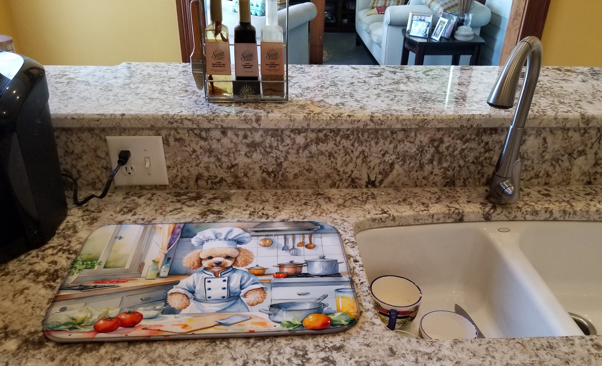 Dish Drying Mat featuring breed specific Poodle artwork. Say goodbye to messy countertops and soggy dish towels with our innovative dish drying mat. Our high-quality dish drying pad is designed to keep your countertops dry while offering a stylish and efficient solution. Whether you're air drying dishes, glasses, stemware, silverware, pots, pans, bottles, or even fruits and vegetables, our dish mat is the perfect choice. The 14 inches x 22 inches size fits most counters and dish drying racks, and the non-slip design ensures stability. Made with water-absorbent polyester and a polyurethane foam insert, our dish drying mat is not only functional but also durable. It's machine washable and printed in the USA for long-lasting use. The beautiful artwork adds flair to your kitchen decor, making it a perfect housewarming gift or present for any occasion. Upgrade your kitchen experience with our absorbent and versatile dish drying mat.
