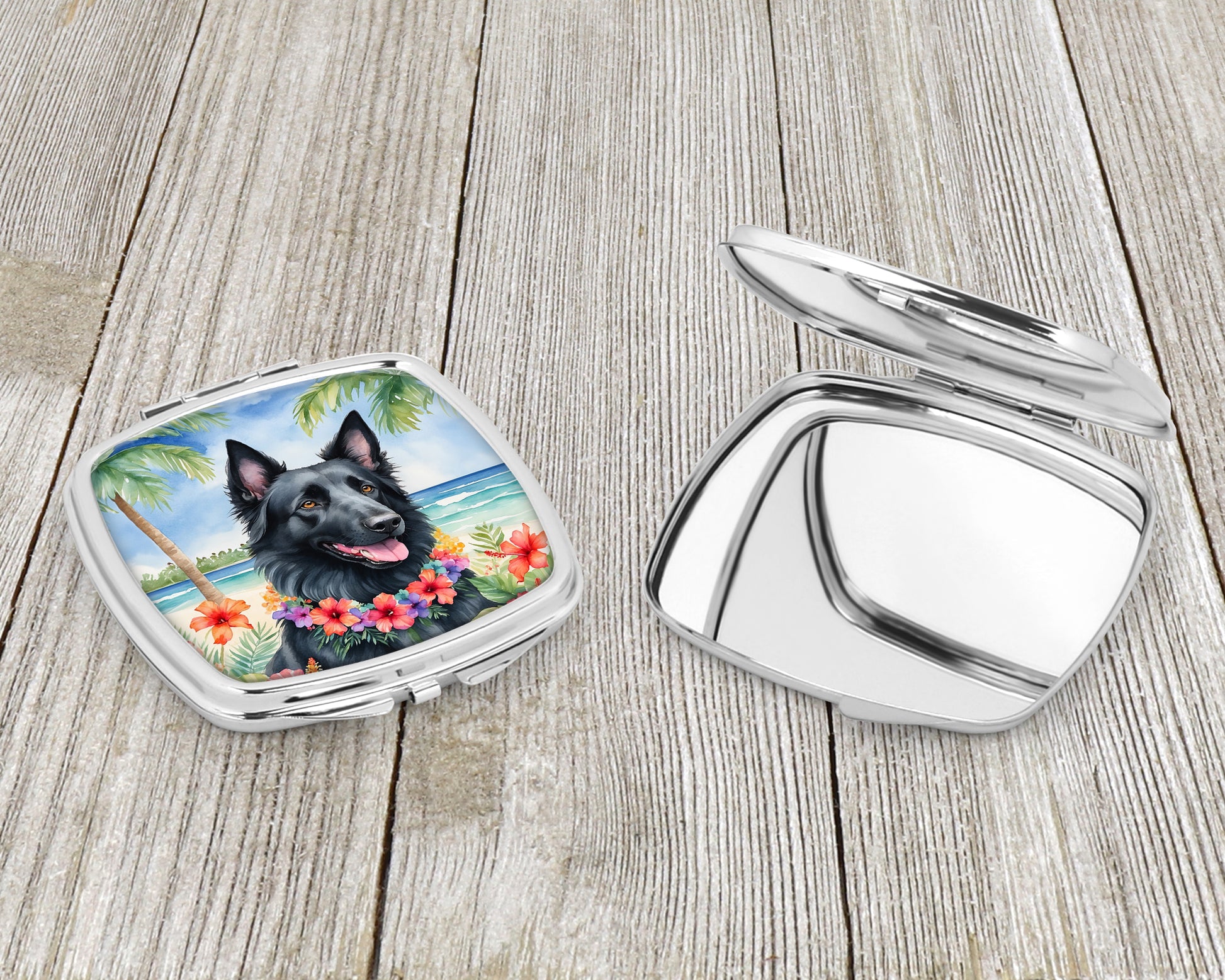 Compact Mirror featuring breed specific Belgian Sheepdog artwork. Introducing our Square Compact Mirror, a blend of elegance, functionality, and compactness, perfect for on-the-go touch-ups. This Silvertone metal mirror, with dimensions of 2.75 inches x 3 inches x .3 inches, fits effortlessly into your purse, handbag, or pocket, ensuring that you can check your appearance anytime, anywhere. Our compact mirror stands out with its eye-catching artwork on the front, adding a dash of style to this practical accessory. It is more than just a mirror; it's a statement piece that reflects your personality and aesthetic. When opened, this compact reveals two mirrors inside, doubling your perspective for precise touch-ups. The Silvertone metal construction ensures durability while maintaining a lightweight feel, making it an ideal everyday carry item. Whether you're rushing to a meeting, prepping for a dinner date, or just need a quick check on your look, our Square Compact Mirror is your reliable companion. Experience the perfect blend of style and practicality with this must-have accessory.