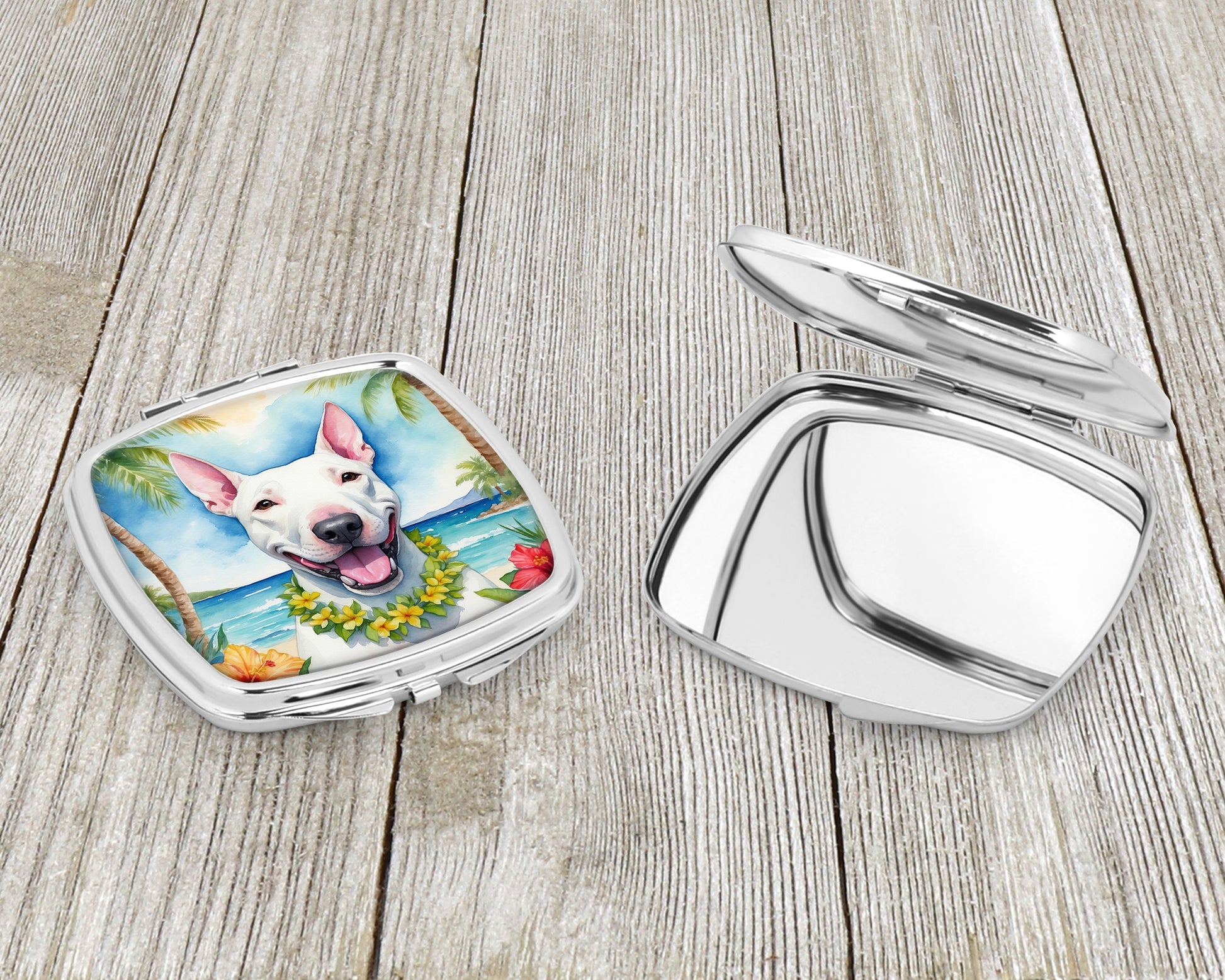 Compact Mirror featuring breed specific Bull Terrier artwork. Introducing our Square Compact Mirror, a blend of elegance, functionality, and compactness, perfect for on-the-go touch-ups. This Silvertone metal mirror, with dimensions of 2.75 inches x 3 inches x .3 inches, fits effortlessly into your purse, handbag, or pocket, ensuring that you can check your appearance anytime, anywhere. Our compact mirror stands out with its eye-catching artwork on the front, adding a dash of style to this practical accessory. It is more than just a mirror; it's a statement piece that reflects your personality and aesthetic. When opened, this compact reveals two mirrors inside, doubling your perspective for precise touch-ups. The Silvertone metal construction ensures durability while maintaining a lightweight feel, making it an ideal everyday carry item. Whether you're rushing to a meeting, prepping for a dinner date, or just need a quick check on your look, our Square Compact Mirror is your reliable companion. Experience the perfect blend of style and practicality with this must-have accessory.