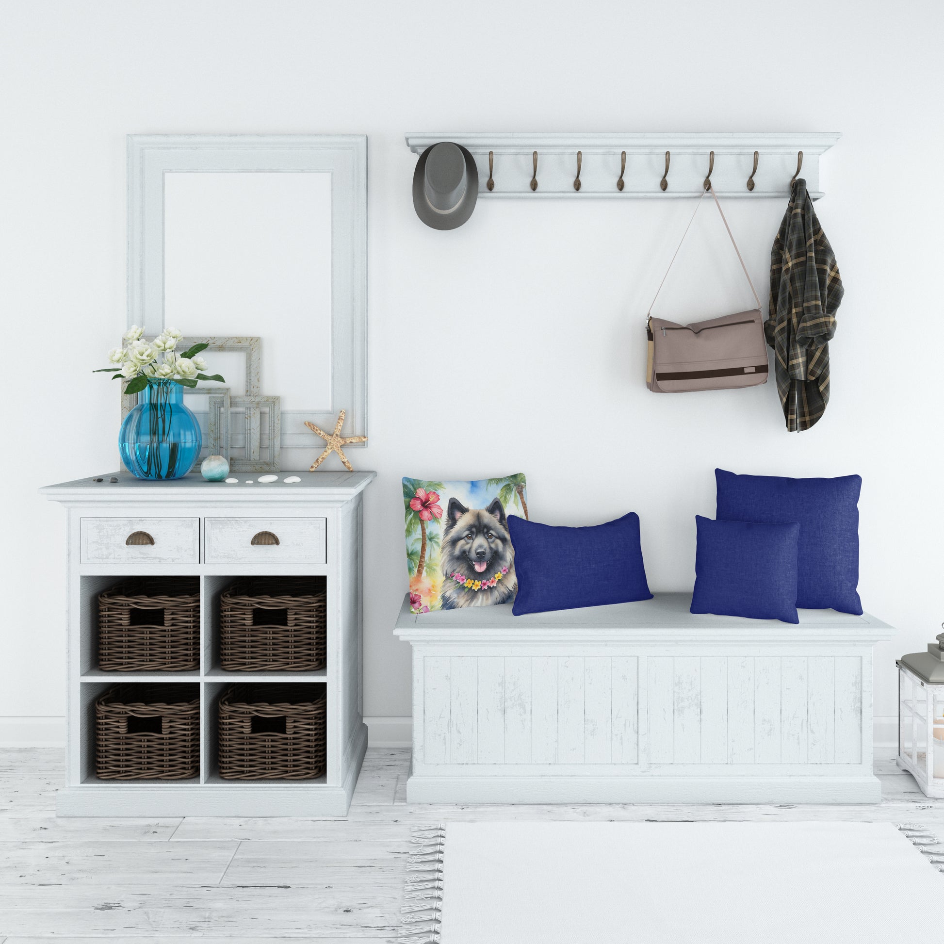 Throw Pillow featuring breed specific Keeshond artwork. Revitalize your outdoor or indoor living space with Caroline's Treasures 18x18 Fabric Decorative Pillow. With a generously sized dimension of approximately 18 inches by 18 inches, this pillow makes a comfortable and aesthetic addition to any seating area. Made from a unique, water-resistant material developed by Caroline's Treasures, the pillow sham is 100% polyester fabric that's durable and ready to weather any condition. Its vibrant, full-color artwork will not fade over time as it is dyed with color-fast dyes. Whether you place it on your patio furniture, porch, veranda, or indoor couch, its soft canvas fabric ensures a cozy experience. The pillow is handcrafted in the United States, featuring a sham created from three pieces of fabric and a polyester insert for enduring shape and overstuffed comfort. Despite being robustly built to endure the outdoors, it is as soft and snug as your favorite indoor cushions. Please note, as all our pillows are handmade, sizes may vary slightly, adding to the charm of this unique decorative item.