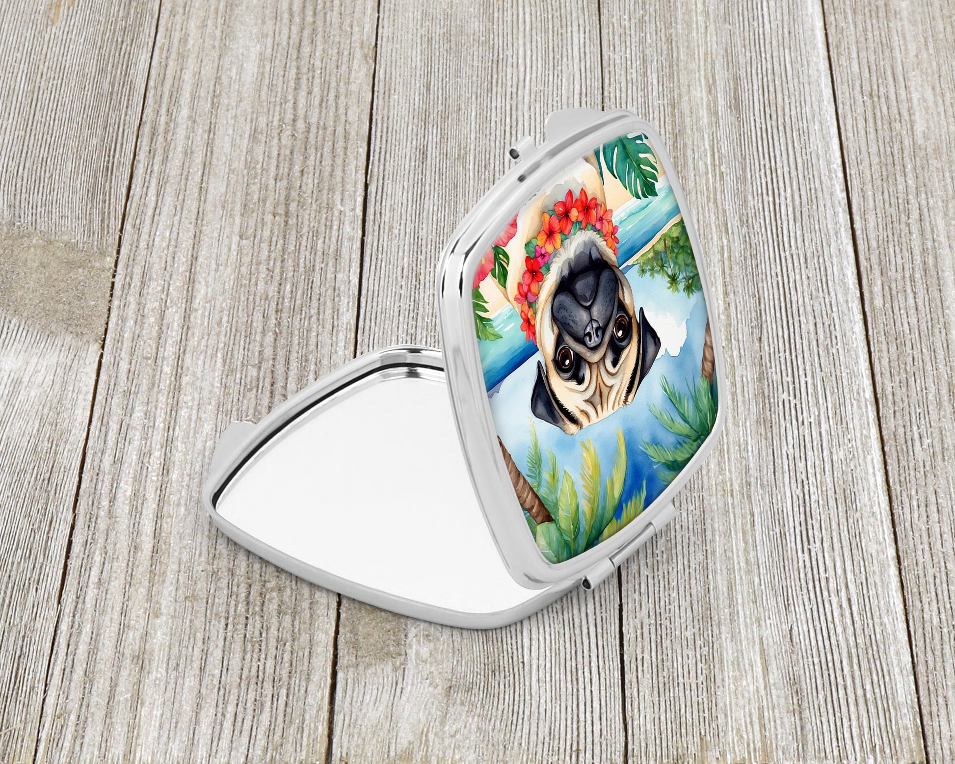Compact Mirror featuring breed specific Pug artwork. Introducing our Square Compact Mirror, a blend of elegance, functionality, and compactness, perfect for on-the-go touch-ups. This Silvertone metal mirror, with dimensions of 2.75 inches x 3 inches x .3 inches, fits effortlessly into your purse, handbag, or pocket, ensuring that you can check your appearance anytime, anywhere. Our compact mirror stands out with its eye-catching artwork on the front, adding a dash of style to this practical accessory. It is more than just a mirror; it's a statement piece that reflects your personality and aesthetic. When opened, this compact reveals two mirrors inside, doubling your perspective for precise touch-ups. The Silvertone metal construction ensures durability while maintaining a lightweight feel, making it an ideal everyday carry item. Whether you're rushing to a meeting, prepping for a dinner date, or just need a quick check on your look, our Square Compact Mirror is your reliable companion. Experience the perfect blend of style and practicality with this must-have accessory.