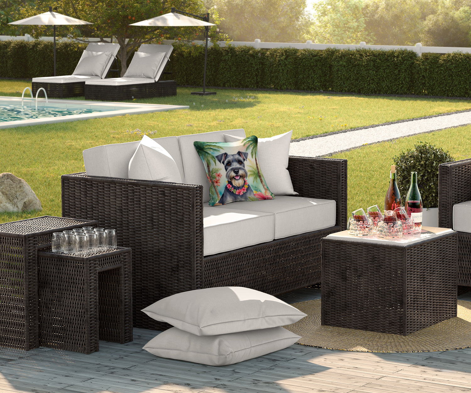 Throw Pillow featuring breed specific Schnauzer artwork. Revitalize your outdoor or indoor living space with Caroline's Treasures 18x18 Fabric Decorative Pillow. With a generously sized dimension of approximately 18 inches by 18 inches, this pillow makes a comfortable and aesthetic addition to any seating area. Made from a unique, water-resistant material developed by Caroline's Treasures, the pillow sham is 100% polyester fabric that's durable and ready to weather any condition. Its vibrant, full-color artwork will not fade over time as it is dyed with color-fast dyes. Whether you place it on your patio furniture, porch, veranda, or indoor couch, its soft canvas fabric ensures a cozy experience. The pillow is handcrafted in the United States, featuring a sham created from three pieces of fabric and a polyester insert for enduring shape and overstuffed comfort. Despite being robustly built to endure the outdoors, it is as soft and snug as your favorite indoor cushions. Please note, as all our pillows are handmade, sizes may vary slightly, adding to the charm of this unique decorative item.