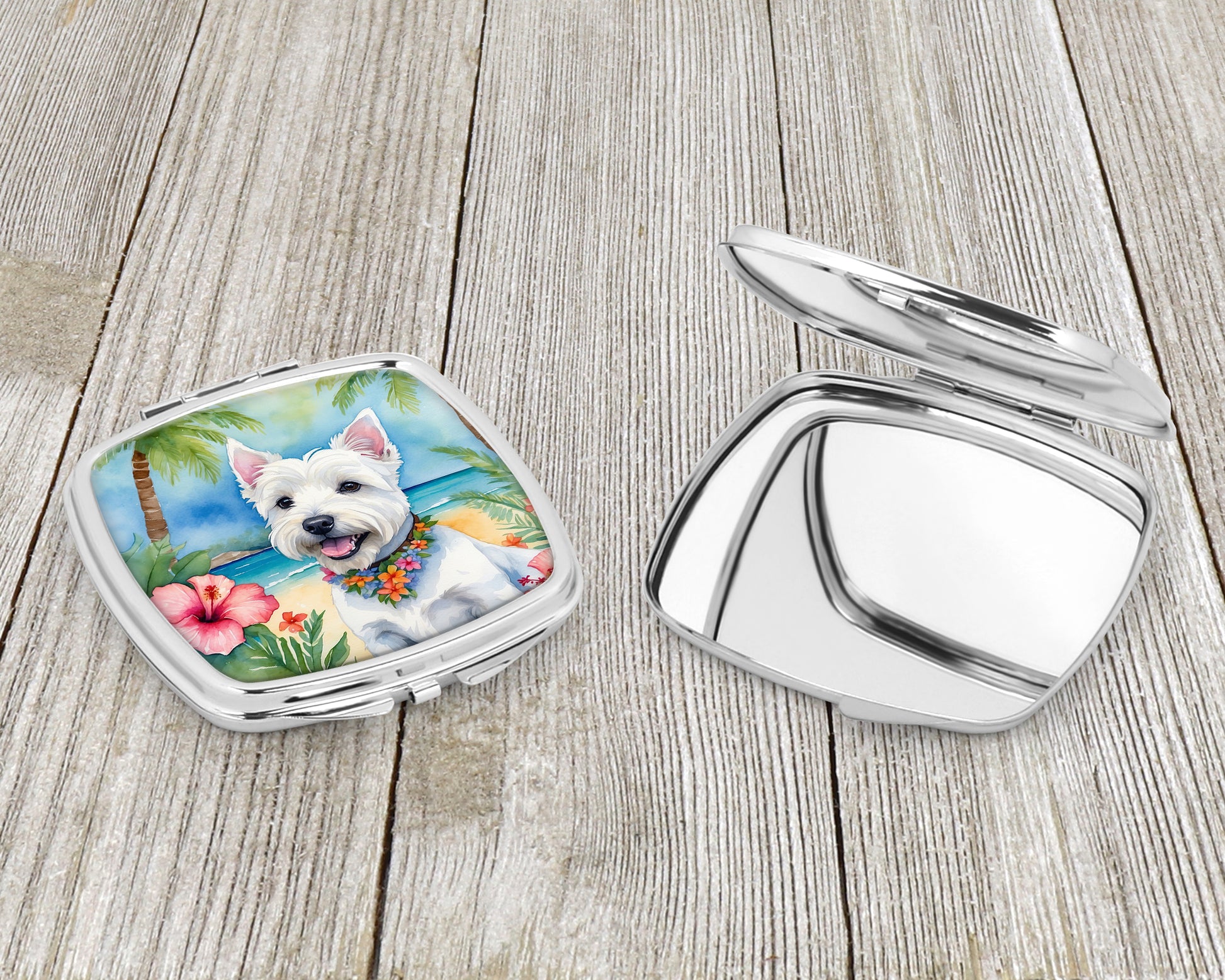 Compact Mirror featuring breed specific West Highland White Terrier artwork. Introducing our Square Compact Mirror, a blend of elegance, functionality, and compactness, perfect for on-the-go touch-ups. This Silvertone metal mirror, with dimensions of 2.75 inches x 3 inches x .3 inches, fits effortlessly into your purse, handbag, or pocket, ensuring that you can check your appearance anytime, anywhere. Our compact mirror stands out with its eye-catching artwork on the front, adding a dash of style to this practical accessory. It is more than just a mirror; it's a statement piece that reflects your personality and aesthetic. When opened, this compact reveals two mirrors inside, doubling your perspective for precise touch-ups. The Silvertone metal construction ensures durability while maintaining a lightweight feel, making it an ideal everyday carry item. Whether you're rushing to a meeting, prepping for a dinner date, or just need a quick check on your look, our Square Compact Mirror is your reliable companion. Experience the perfect blend of style and practicality with this must-have accessory.