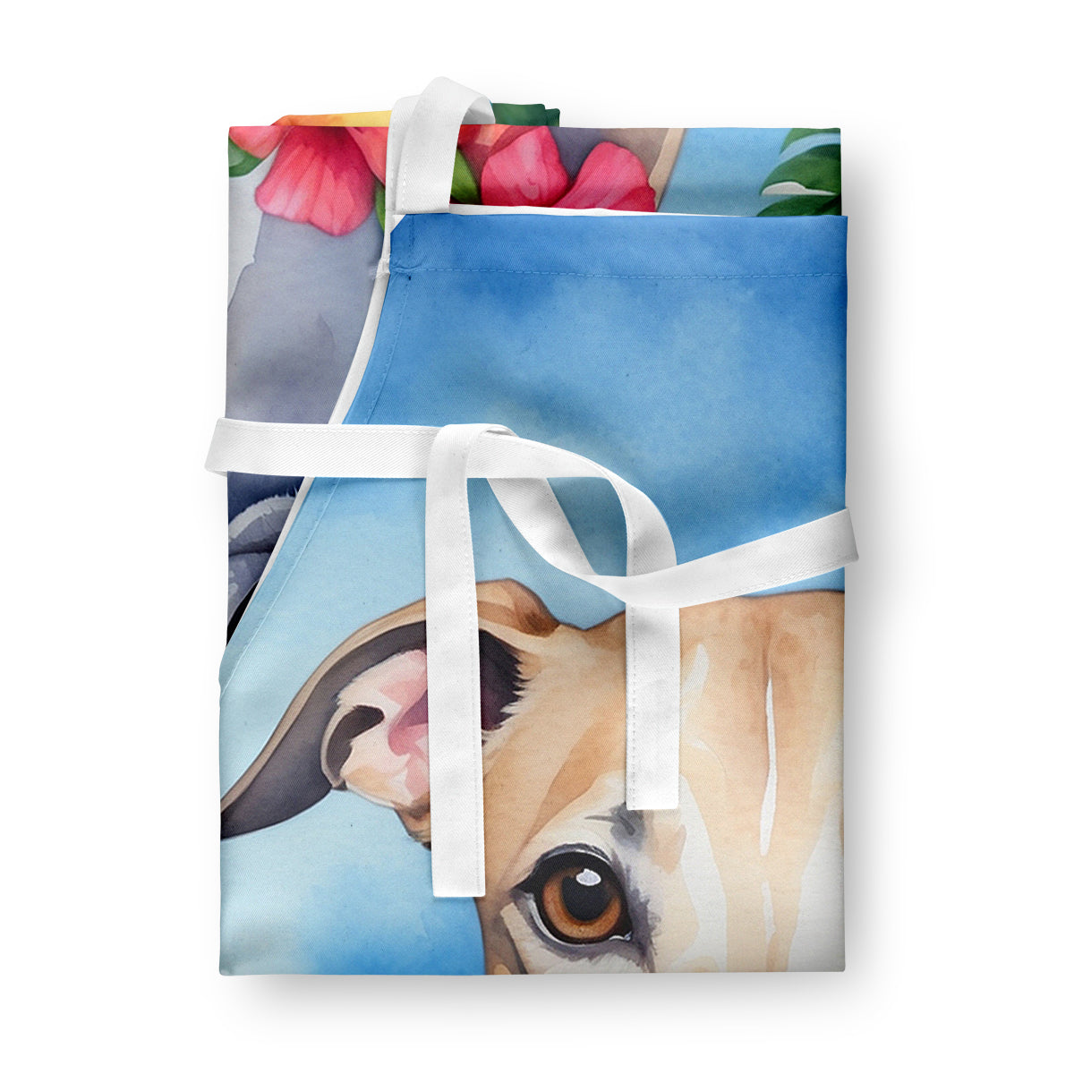 Apron featuring breed specific Whippet artwork. Elevate your cooking, baking, and grilling experiences with our versatile Kitchen or BBQ Apron. This Bib Style apron isn't just limited to culinary activities - it also serves as an excellent baking apron, artist apron, server apron, gardening apron, or even a dog grooming apron. The apron showcases vibrant full-color artwork contributed by one of our talented artists, bringing a dash of style to your daily tasks. With dimensions of approximately 27"W x 30"H, it provides ample coverage to protect your clothing from spills and splashes. Our apron is meticulously crafted from 100% Ultra Spun Polyester, known for its durability and lightweight nature. The apron comes with white tie straps, ensuring a comfortable and adjustable fit for all. It's a perfect choice for kitchen apron enthusiasts, whether you are a woman or a man. Designed for easy maintenance, this apron is fully machine washable. The quick-drying polyester material actively reduces staining, keeping your apron looking fresh and new for longer. Our beautifully designed apron isn't just a functional kitchen accessory - it's a fashion statement in the culinary world!
