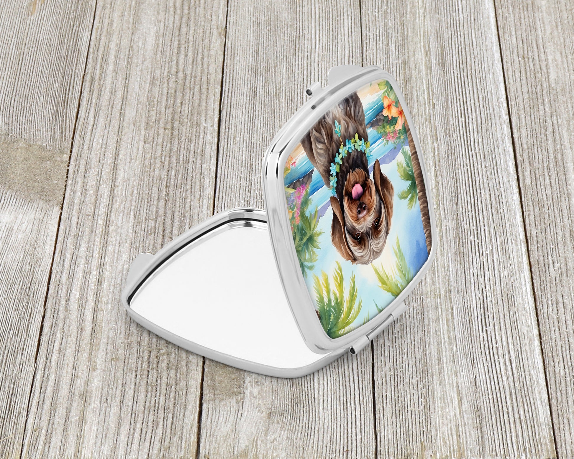 Compact Mirror featuring breed specific Wirehaired Pointing Griffon artwork. Introducing our Square Compact Mirror, a blend of elegance, functionality, and compactness, perfect for on-the-go touch-ups. This Silvertone metal mirror, with dimensions of 2.75 inches x 3 inches x .3 inches, fits effortlessly into your purse, handbag, or pocket, ensuring that you can check your appearance anytime, anywhere. Our compact mirror stands out with its eye-catching artwork on the front, adding a dash of style to this practical accessory. It is more than just a mirror; it's a statement piece that reflects your personality and aesthetic. When opened, this compact reveals two mirrors inside, doubling your perspective for precise touch-ups. The Silvertone metal construction ensures durability while maintaining a lightweight feel, making it an ideal everyday carry item. Whether you're rushing to a meeting, prepping for a dinner date, or just need a quick check on your look, our Square Compact Mirror is your reliable companion. Experience the perfect blend of style and practicality with this must-have accessory.