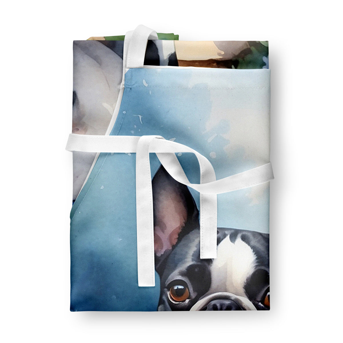 Apron featuring breed specific Boston Terrier artwork. Elevate your cooking, baking, and grilling experiences with our versatile Kitchen or BBQ Apron. This Bib Style apron isn't just limited to culinary activities - it also serves as an excellent baking apron, artist apron, server apron, gardening apron, or even a dog grooming apron. The apron showcases vibrant full-color artwork contributed by one of our talented artists, bringing a dash of style to your daily tasks. With dimensions of approximately 27"W x 30"H, it provides ample coverage to protect your clothing from spills and splashes. Our apron is meticulously crafted from 100% Ultra Spun Polyester, known for its durability and lightweight nature. The apron comes with white tie straps, ensuring a comfortable and adjustable fit for all. It's a perfect choice for kitchen apron enthusiasts, whether you are a woman or a man. Designed for easy maintenance, this apron is fully machine washable. The quick-drying polyester material actively reduces staining, keeping your apron looking fresh and new for longer. Our beautifully designed apron isn't just a functional kitchen accessory - it's a fashion statement in the culinary world!