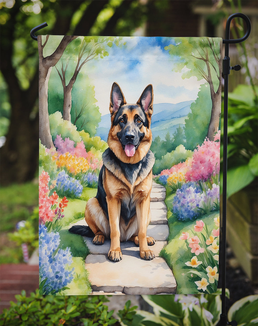 Garden Flag featuring breed specific German Shepherd artwork. Enhance the beauty of your garden, patio, or yard with Caroline's Treasures Decorative Garden Flag, proudly made in the USA. Crafted from two pieces of thick, double-sided polyester fabric, this 2-ply garden flag is designed to withstand various weather conditions, making it water-resistant and weatherproof. Featuring correctly readable words on both sides, this garden flag offers a delightful visual experience from any angle. With its heavier weight, it stands out among other garden flags, ensuring stability and durability even in wind, rain, and snow. Measuring approximately 11 1/4 inches by 15 1/2 inches, this flag allows you to personalize your outdoor decor. It comes with a 1 1/2-inch sleeve sewn in, allowing easy attachment to any standard garden flag stand or garden size porch hanger (sold separately). Make a statement in your outdoor space with Caroline's Treasures Decorative Garden Flag, a vibrant and high-quality flag that adds color and personality to your surroundings. Proudly made in the USA, it's a symbol of quality craftsmanship and attention to detail.