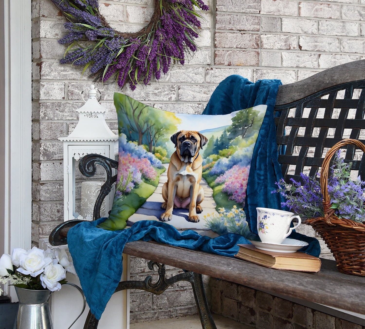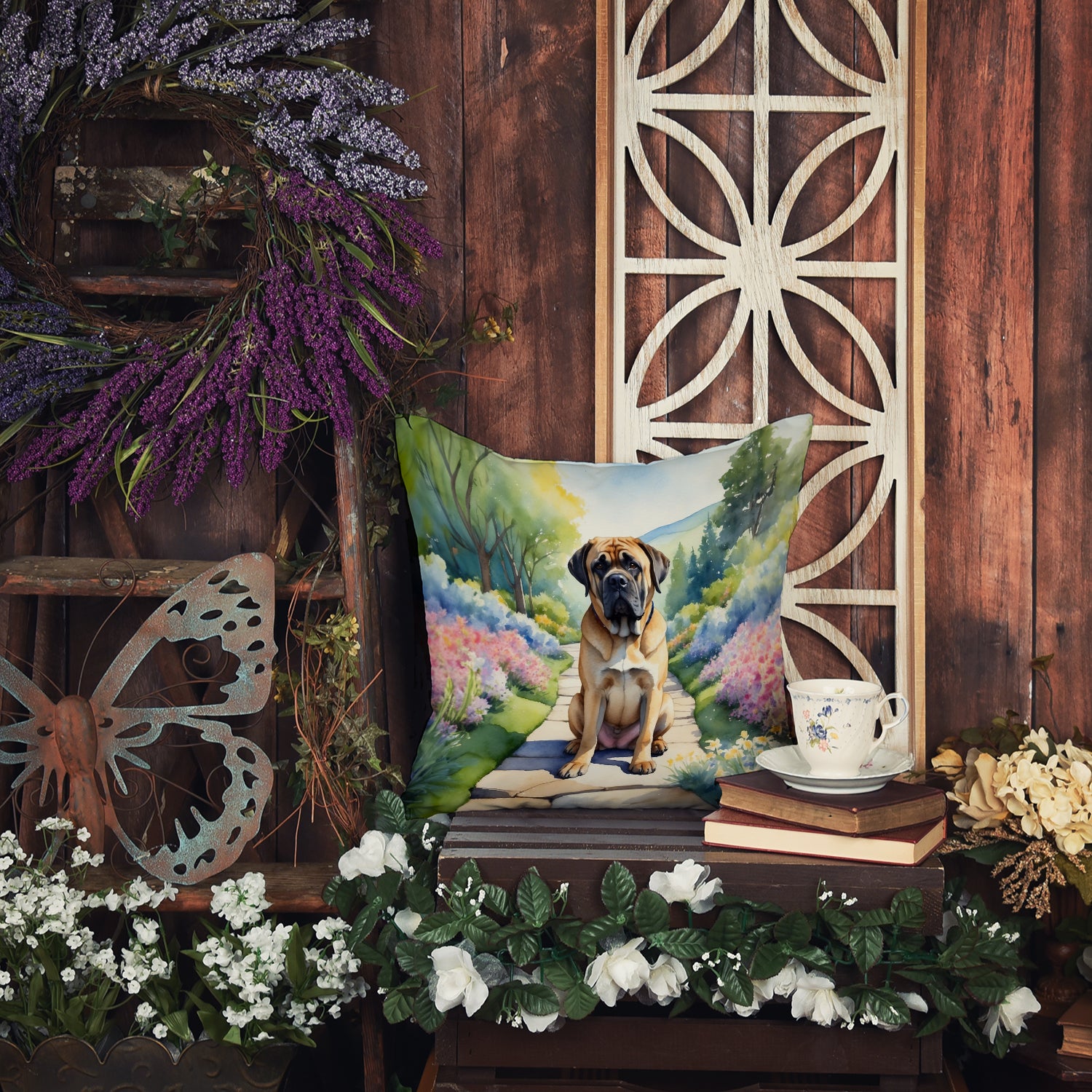 Throw Pillow featuring breed specific Mastiff artwork. Revitalize your outdoor or indoor living space with Caroline's Treasures 18x18 Fabric Decorative Pillow. With a generously sized dimension of approximately 18 inches by 18 inches, this pillow makes a comfortable and aesthetic addition to any seating area. Made from a unique, water-resistant material developed by Caroline's Treasures, the pillow sham is 100% polyester fabric that's durable and ready to weather any condition. Its vibrant, full-color artwork will not fade over time as it is dyed with color-fast dyes. Whether you place it on your patio furniture, porch, veranda, or indoor couch, its soft canvas fabric ensures a cozy experience. The pillow is handcrafted in the United States, featuring a sham created from three pieces of fabric and a polyester insert for enduring shape and overstuffed comfort. Despite being robustly built to endure the outdoors, it is as soft and snug as your favorite indoor cushions. Please note, as all our pillows are handmade, sizes may vary slightly, adding to the charm of this unique decorative item.