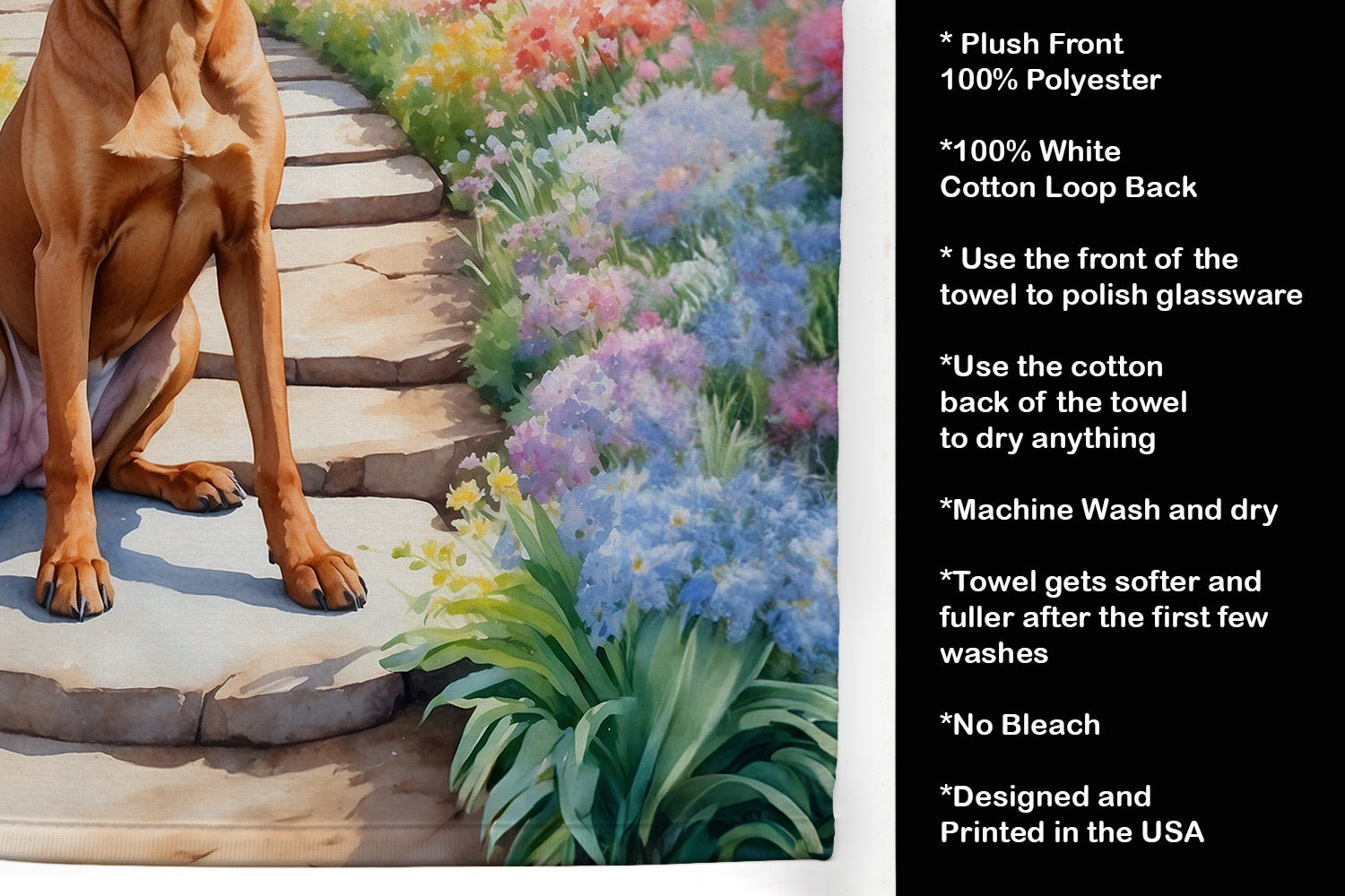 Kitchen Towel featuring breed specific Rhodesian Ridgeback artwork. Experience the perfect blend of aesthetic appeal and functional excellence with our Plush Velour Kitchen Towels. These are not your ordinary decorative kitchen towels that gather dust. Instead, they are designed to be as practical as they are stylish. The front layer of our towel is constructed from a minky plush polyester, known for its durability and color retention. Unlike conventional kitchen towels, the artwork on our towels is dyed directly into the fabric, ensuring vibrant colors that last. Polish your glassware to a brilliant sparkle using the plush front side of the towel. Flip to the back, crafted from 100% cotton terry loop, to exploit its exceptional absorbency for drying dishes or wiping down counters. Our kitchen towels redefine the concept of functional art, offering lasting quality that maintains the towel's shape over time. Measuring 15 inches by 25 inches and weighing 2.3 lbs per dozen, these towels deliver an overwhelming sensory experience with their soft, plush, and smooth texture. The edges are meticulously finished with binding, enhancing their durability and visual appeal. For your convenience, these towels are machine washable and can be dried on low heat. After the first wash, the top fabric becomes even softer and fluffier, eliminating the need for ironing. Treat your kitchen to the luxury and functionality it deserves with our plush velour kitchen towels.