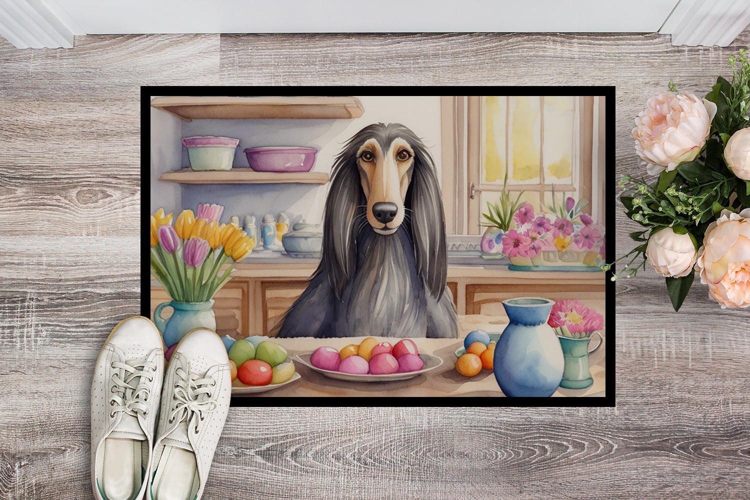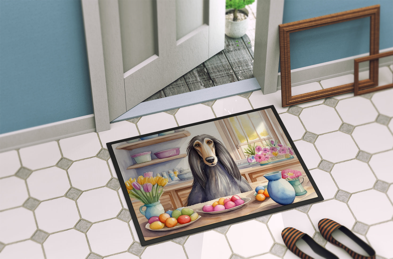 Doormat featuring breed specific Afghan Hound artwork. Celebrate Easter with this Easter Doormat. Welcome your guests in style with our Artwork Door Mat, designed to withstand almost any weather condition. This mat, measuring approximately 24 by 36 inches, is held together by durable black binding tape. Its top layer, composed of polyester felt, is dyed with the eye-catching image you see on the mat. A few layers below provide the mat with stability, while its rubber bottom is stamped to help prevent slipping and ensures safety. Our mat works wonderfully as both an indoor or outdoor door mat. For cleaning, simply hose it off with water or use a power washer - no need for any cleaner that produces suds. Avoid scrubbing with a brush, instead, opt for the vacuum on floor setting. Designed manufactured and printed in the USA, this mat is a perfect addition to your porch, outdoor kitchen, entryway, or any indoor space. Its unique design makes it a charming decorative rug that greets your guests and adds a stylish touch to your home decor.