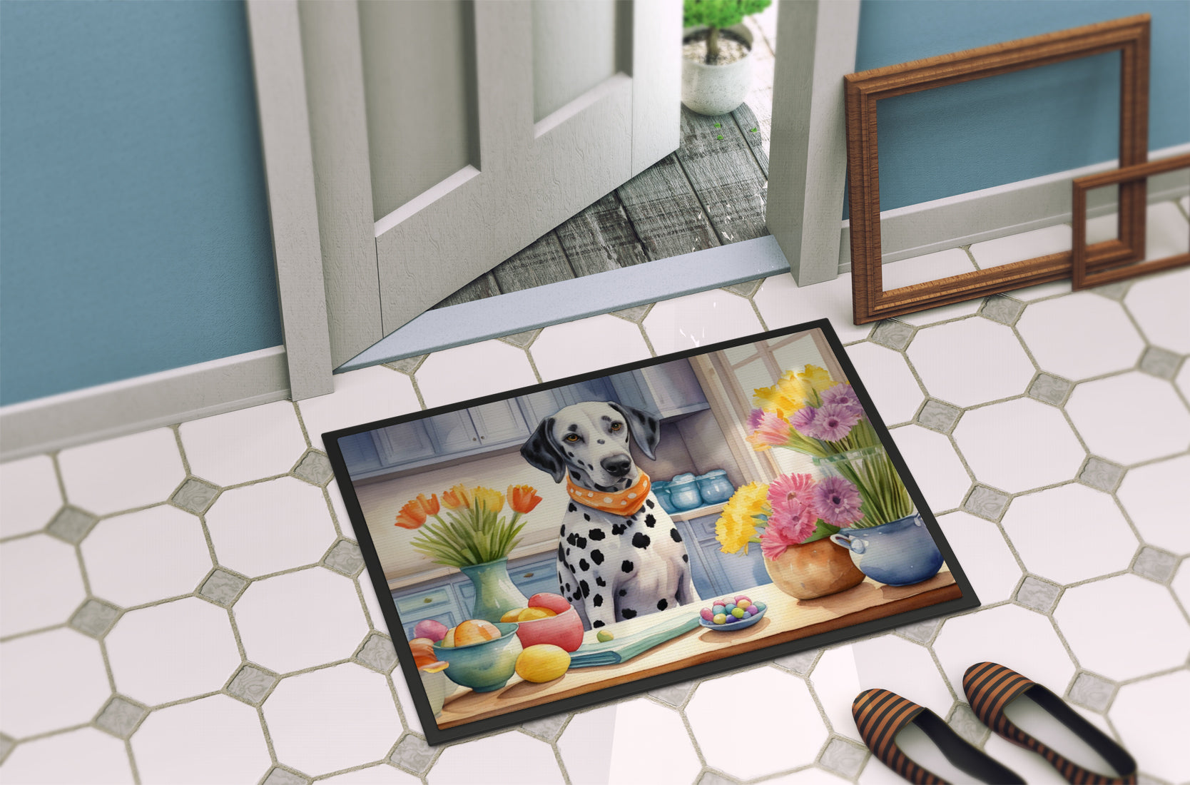 Doormat featuring breed specific Dalmatian artwork. Celebrate Easter with this Easter Doormat. Welcome your guests in style with our Artwork Door Mat, designed to withstand almost any weather condition. This mat, measuring approximately 24 by 36 inches, is held together by durable black binding tape. Its top layer, composed of polyester felt, is dyed with the eye-catching image you see on the mat. A few layers below provide the mat with stability, while its rubber bottom is stamped to help prevent slipping and ensures safety. Our mat works wonderfully as both an indoor or outdoor door mat. For cleaning, simply hose it off with water or use a power washer - no need for any cleaner that produces suds. Avoid scrubbing with a brush, instead, opt for the vacuum on floor setting. Designed manufactured and printed in the USA, this mat is a perfect addition to your porch, outdoor kitchen, entryway, or any indoor space. Its unique design makes it a charming decorative rug that greets your guests and adds a stylish touch to your home decor.