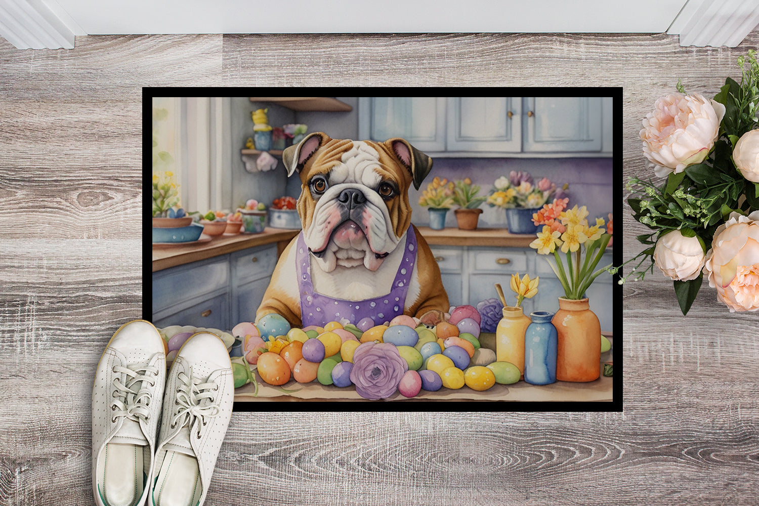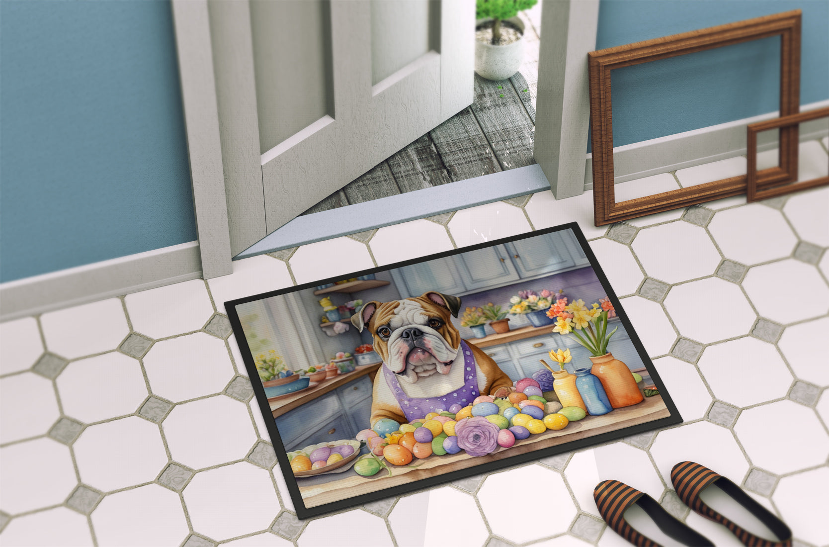 Doormat featuring breed specific English Bulldog artwork. Celebrate Easter with this Easter Doormat. Welcome your guests in style with our Artwork Door Mat, designed to withstand almost any weather condition. This mat, measuring approximately 18 by 27 inches, is held together by durable black binding tape. Its top layer, composed of polyester felt, is dyed with the eye-catching image you see on the mat. A few layers below provide the mat with stability, while its rubber bottom is stamped to help prevent slipping and ensures safety. Our mat works wonderfully as both an indoor or outdoor door mat. For cleaning, simply hose it off with water or use a power washer - no need for any cleaner that produces suds. Avoid scrubbing with a brush, instead, opt for the vacuum on floor setting. Designed manufactured and printed in the USA, this mat is a perfect addition to your porch, outdoor kitchen, entryway, or any indoor space. Its unique design makes it a charming decorative rug that greets your guests and adds a stylish touch to your home decor.