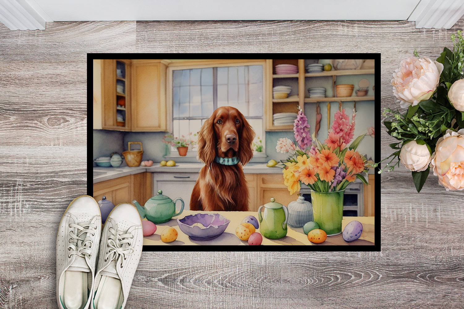 Doormat featuring breed specific Irish Setter artwork. Celebrate Easter with this Easter Doormat. Welcome your guests in style with our Artwork Door Mat, designed to withstand almost any weather condition. This mat, measuring approximately 18 by 27 inches, is held together by durable black binding tape. Its top layer, composed of polyester felt, is dyed with the eye-catching image you see on the mat. A few layers below provide the mat with stability, while its rubber bottom is stamped to help prevent slipping and ensures safety. Our mat works wonderfully as both an indoor or outdoor door mat. For cleaning, simply hose it off with water or use a power washer - no need for any cleaner that produces suds. Avoid scrubbing with a brush, instead, opt for the vacuum on floor setting. Designed manufactured and printed in the USA, this mat is a perfect addition to your porch, outdoor kitchen, entryway, or any indoor space. Its unique design makes it a charming decorative rug that greets your guests and adds a stylish touch to your home decor.