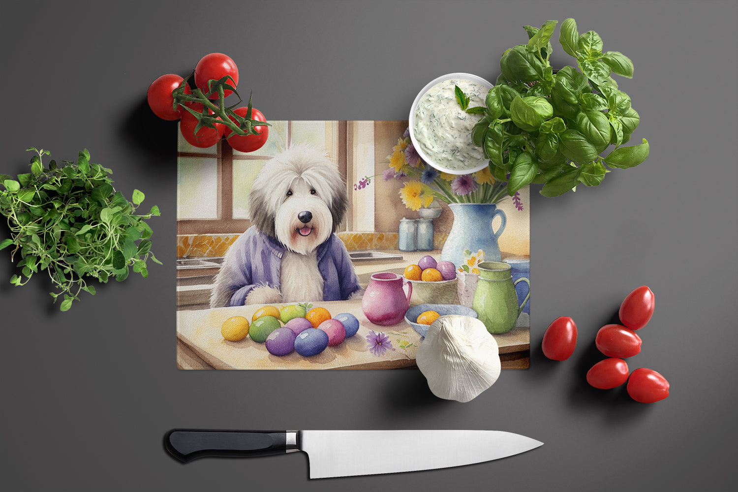 Decorating Easter Old English Sheepdog Glass Cutting Board
