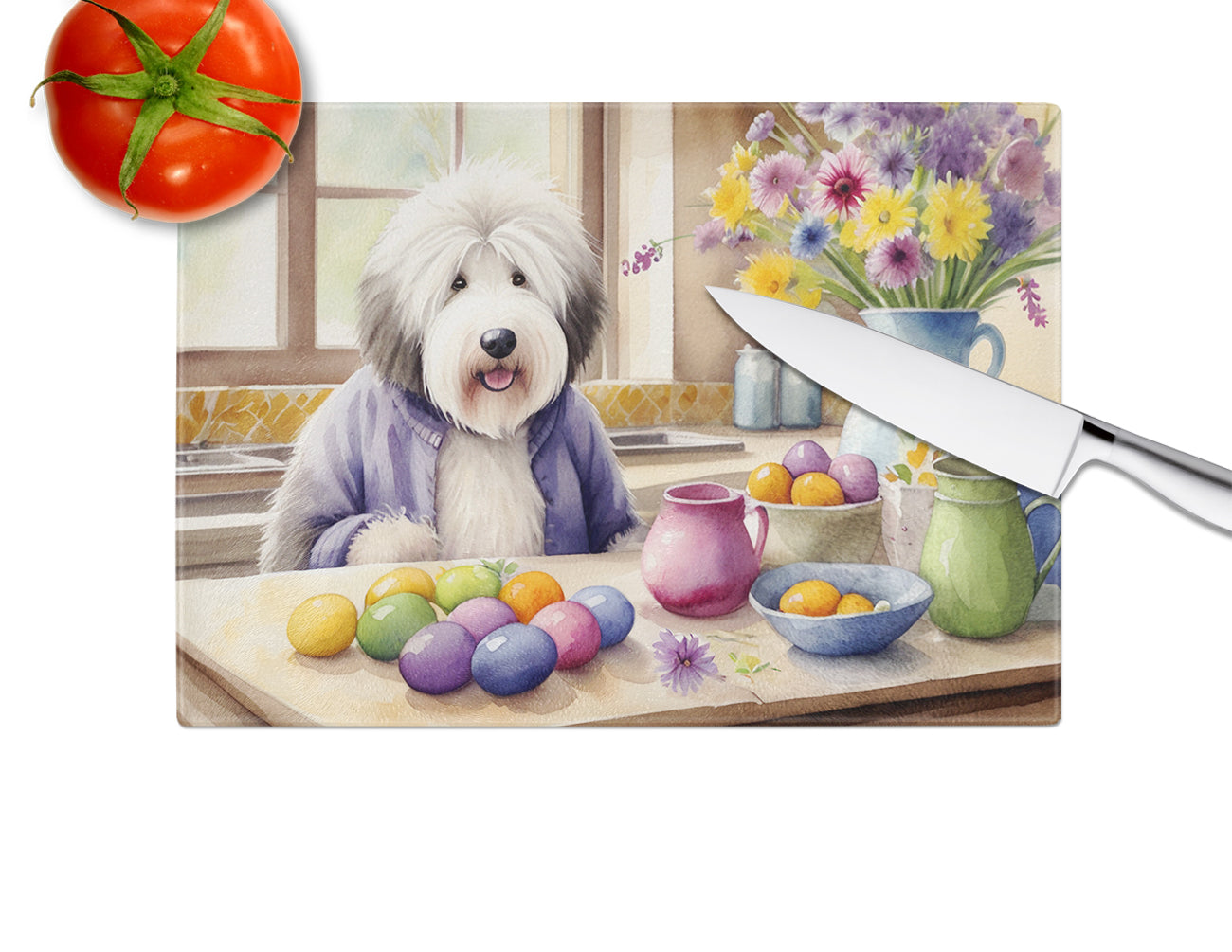 Glass Cutting Board featuring breed specific Old English Sheepdog artwork. Celebrate Easter with this Easter Cutting Board. Introduce your kitchen to the vibrant, large Decorative Glass Cutting Board from Caroline's Treasures. Crafted from resilient tempered glass, this board is not only a utilitarian necessity but also a colorful art piece. With its generous dimensions of 15 inches in height and 12 inches in length, it offers ample space for all your cutting needs. Every piece showcases captivating artwork from distinguished artists, bringing an aesthetic edge to your kitchen. Beyond its attractive design, this cutting board ensures your countertop stays pristine and unscathed, owing to its heat-resistant properties. Engineered with user convenience in mind, it features non-skid feet for stability, and rounded corners for additional safety. Its robust construction renders it virtually unbreakable, guaranteeing longevity. The board comes with protective feet bumpers, maintaining its position during use. This product is recommended to be hand washed only. Proudly printed and assembled in the United States, this cutting board exemplifies superior craftsmanship. With Caroline's Treasures' Decorative Glass Cutting Board, you're investing in a blend of functionality and artistic flair.