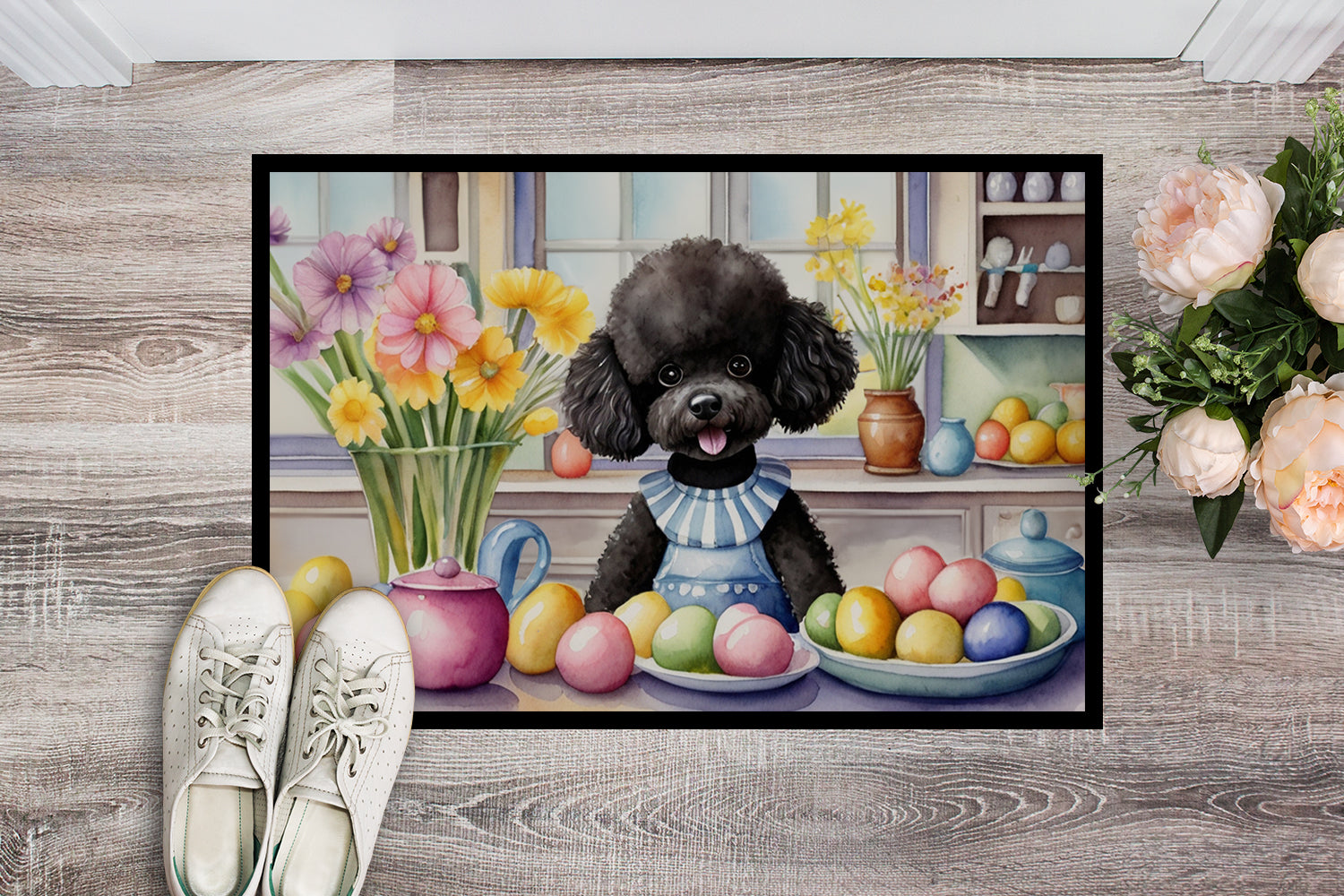 Doormat featuring breed specific Poodle artwork. Celebrate Easter with this Easter Doormat. Welcome your guests in style with our Artwork Door Mat, designed to withstand almost any weather condition. This mat, measuring approximately 24 by 36 inches, is held together by durable black binding tape. Its top layer, composed of polyester felt, is dyed with the eye-catching image you see on the mat. A few layers below provide the mat with stability, while its rubber bottom is stamped to help prevent slipping and ensures safety. Our mat works wonderfully as both an indoor or outdoor door mat. For cleaning, simply hose it off with water or use a power washer - no need for any cleaner that produces suds. Avoid scrubbing with a brush, instead, opt for the vacuum on floor setting. Designed manufactured and printed in the USA, this mat is a perfect addition to your porch, outdoor kitchen, entryway, or any indoor space. Its unique design makes it a charming decorative rug that greets your guests and adds a stylish touch to your home decor.