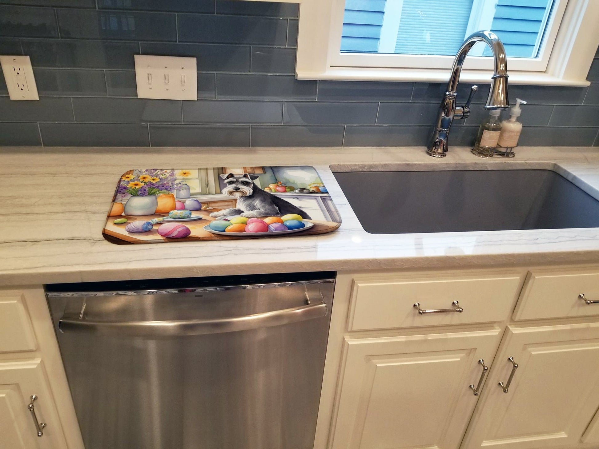 Dish Drying Mat featuring breed specific Schnauzer artwork. Celebrate Easter with this Easter Dish Drying Mat. Say goodbye to messy countertops and soggy dish towels with our innovative dish drying mat. Our high-quality dish drying pad is designed to keep your countertops dry while offering a stylish and efficient solution. Whether you're air drying dishes, glasses, stemware, silverware, pots, pans, bottles, or even fruits and vegetables, our dish mat is the perfect choice. The 14 inches x 22 inches size fits most counters and dish drying racks, and the non-slip design ensures stability. Made with water-absorbent polyester and a polyurethane foam insert, our dish drying mat is not only functional but also durable. It's machine washable and printed in the USA for long-lasting use. The beautiful artwork adds flair to your kitchen decor, making it a perfect housewarming gift or present for any occasion. Upgrade your kitchen experience with our absorbent and versatile dish drying mat.