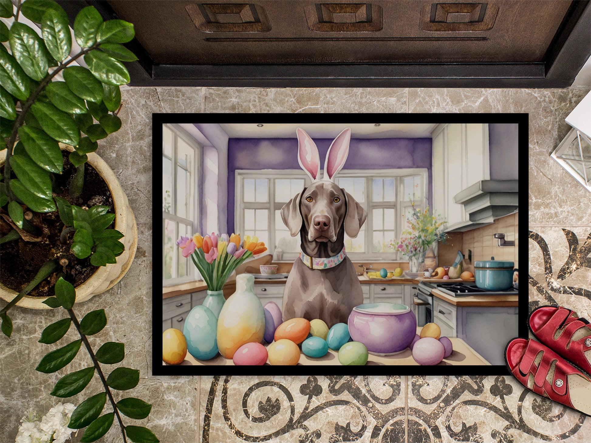 Doormat featuring breed specific Weimaraner artwork. Celebrate Easter with this Easter Doormat. Welcome your guests in style with our Artwork Door Mat, designed to withstand almost any weather condition. This mat, measuring approximately 18 by 27 inches, is held together by durable black binding tape. Its top layer, composed of polyester felt, is dyed with the eye-catching image you see on the mat. A few layers below provide the mat with stability, while its rubber bottom is stamped to help prevent slipping and ensures safety. Our mat works wonderfully as both an indoor or outdoor door mat. For cleaning, simply hose it off with water or use a power washer - no need for any cleaner that produces suds. Avoid scrubbing with a brush, instead, opt for the vacuum on floor setting. Designed manufactured and printed in the USA, this mat is a perfect addition to your porch, outdoor kitchen, entryway, or any indoor space. Its unique design makes it a charming decorative rug that greets your guests and adds a stylish touch to your home decor.