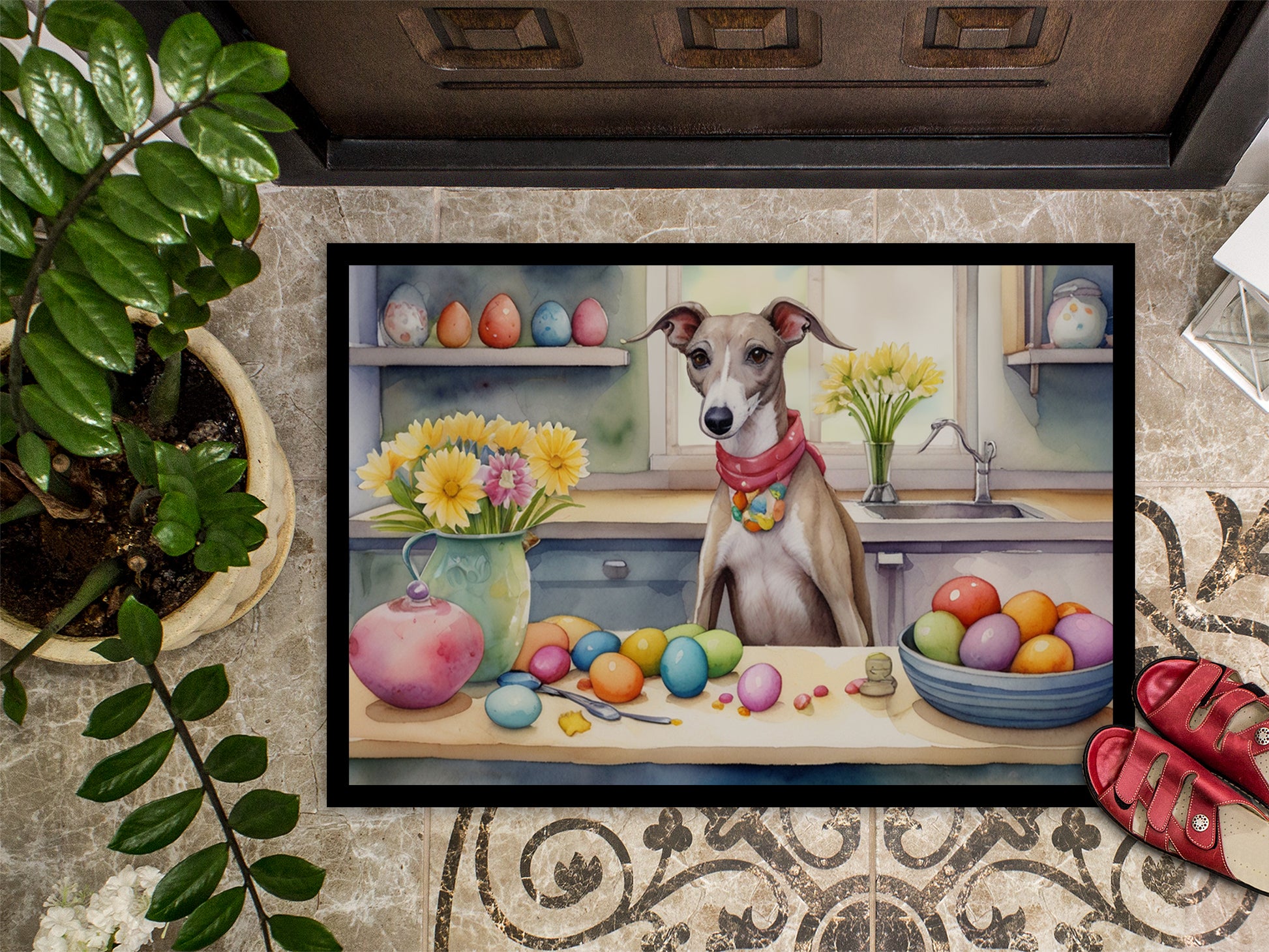 Doormat featuring breed specific Whippet artwork. Celebrate Easter with this Easter Doormat. Welcome your guests in style with our Artwork Door Mat, designed to withstand almost any weather condition. This mat, measuring approximately 18 by 27 inches, is held together by durable black binding tape. Its top layer, composed of polyester felt, is dyed with the eye-catching image you see on the mat. A few layers below provide the mat with stability, while its rubber bottom is stamped to help prevent slipping and ensures safety. Our mat works wonderfully as both an indoor or outdoor door mat. For cleaning, simply hose it off with water or use a power washer - no need for any cleaner that produces suds. Avoid scrubbing with a brush, instead, opt for the vacuum on floor setting. Designed manufactured and printed in the USA, this mat is a perfect addition to your porch, outdoor kitchen, entryway, or any indoor space. Its unique design makes it a charming decorative rug that greets your guests and adds a stylish touch to your home decor.